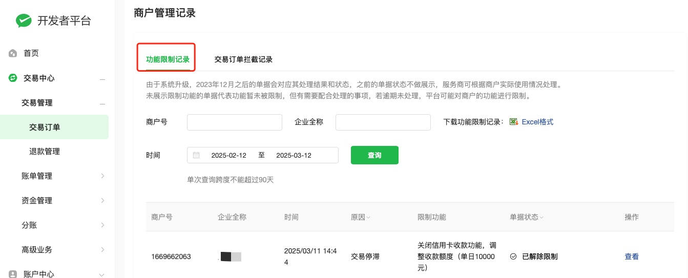 登录微信支付后台,在交易订单-功能限制记录中进行申请解除限制