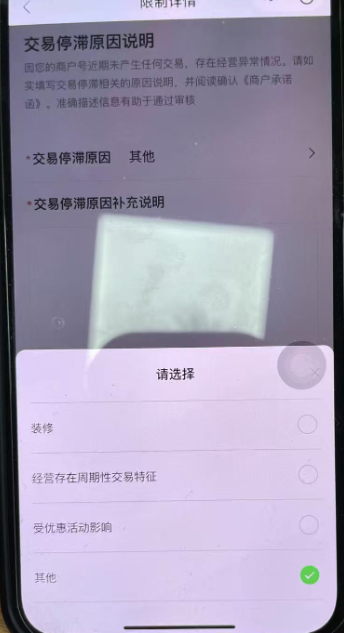 - 选择交易停滞原因,有四种选项:装修、经营存在周期性交易特征、受优惠活动影响、其他