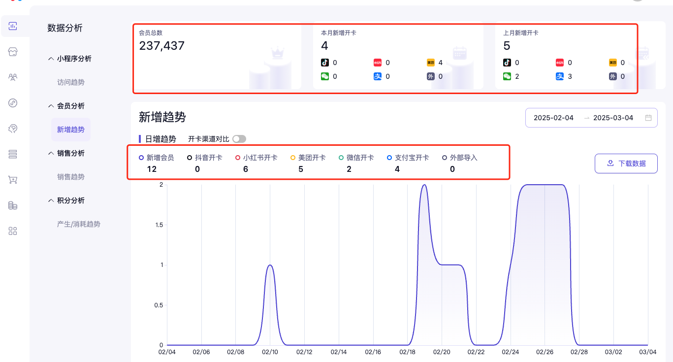 - 你可以在这里查看新增会员数据,包括会员总数,本月/上月支付宝,微信,抖音,小红书、美团及外部导入的会员数据。