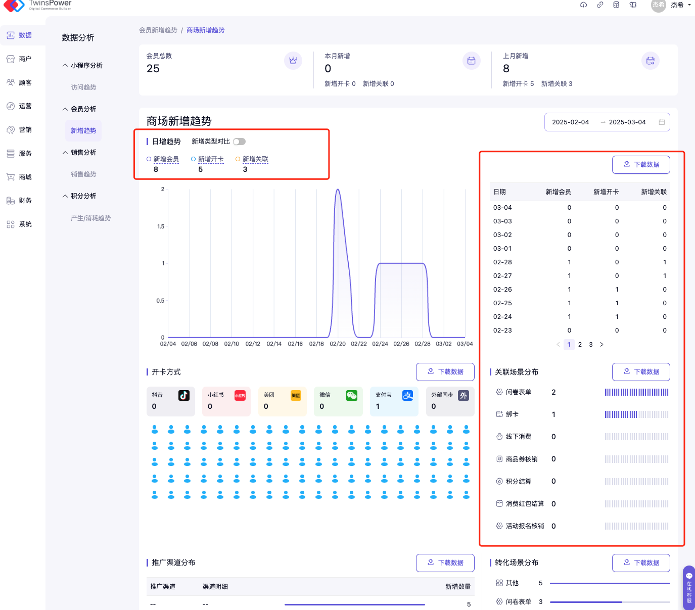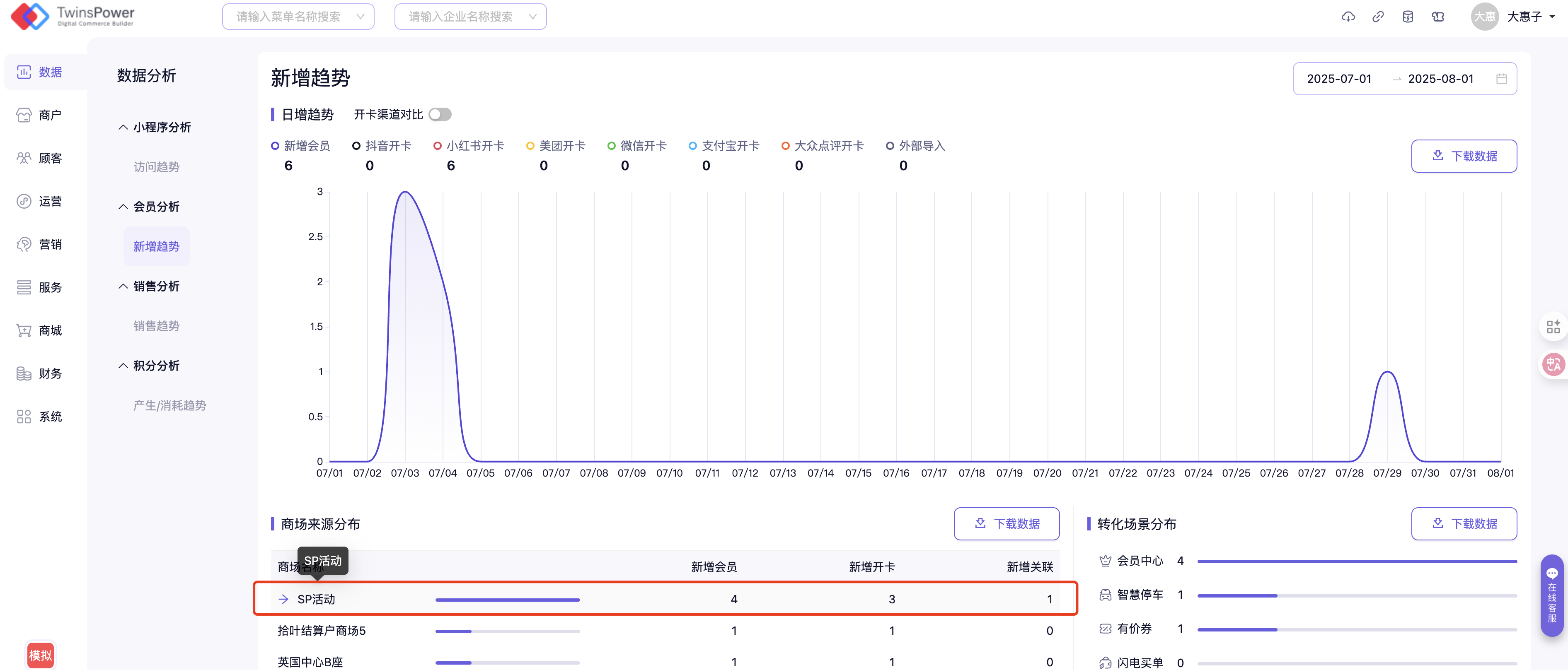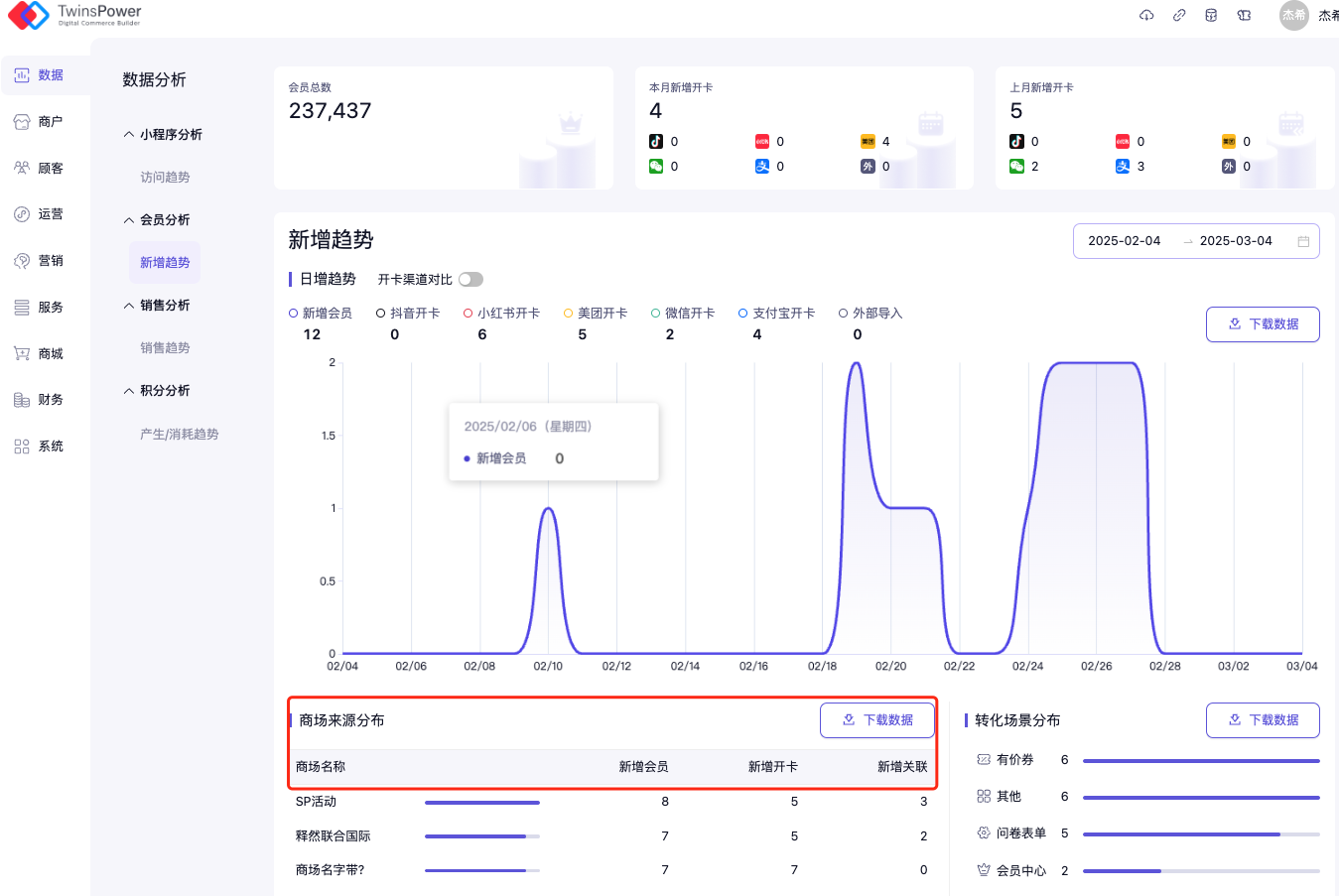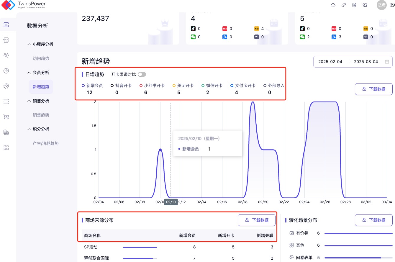 对于单商场模式,将会在新增趋势页面直接获取本商场的会员总数,本月新增数量,上月新增数量,即日增趋势图及数据表格。同时可以看到会员的开卡来源及转化场景数据。