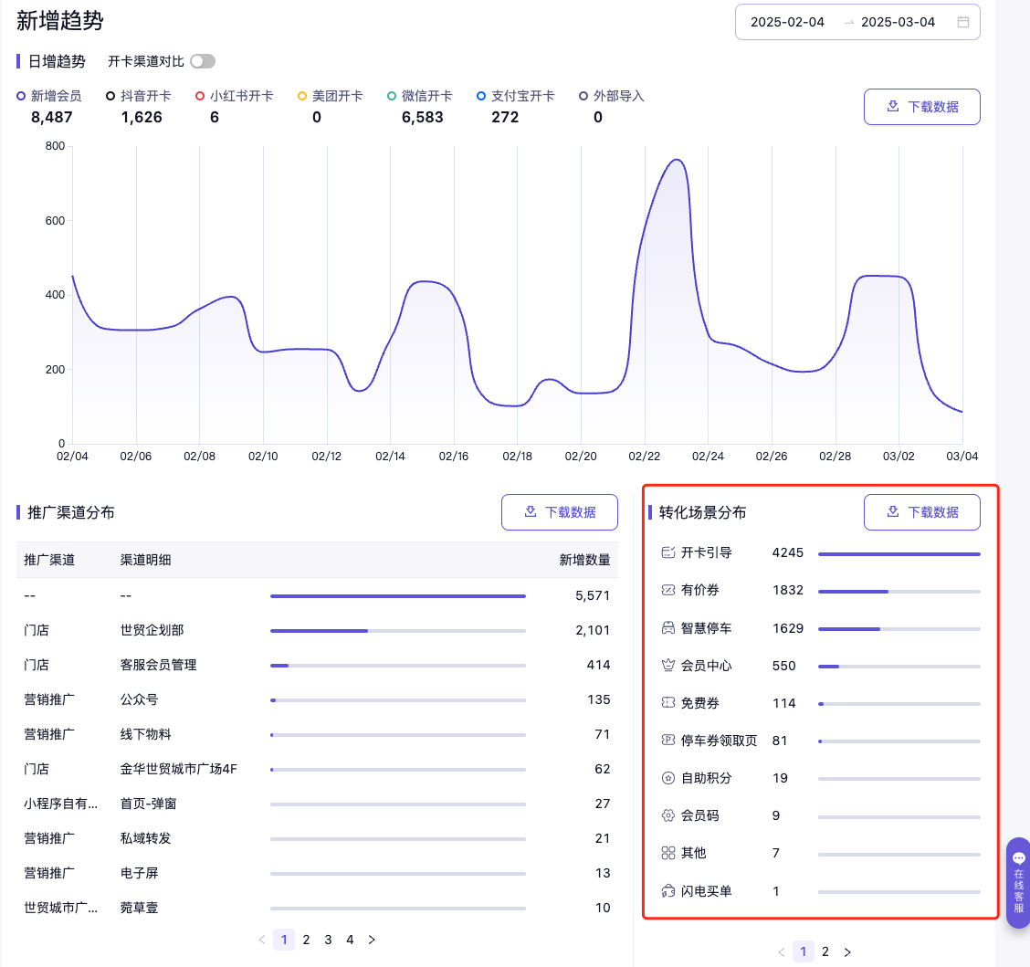 - 推广渠道分布:顾客通过带有推广渠道的二维码/链接进行开卡成为会员的,将会记录此数据,商场侧便可知晓各渠道会员转化率,从而有针对性的调整营销计划。