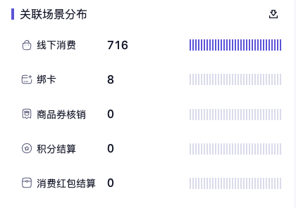 关联场景分布:该部分数据是指非本商场(多商场项目)开卡会员,但在本商场进行了线下消费,绑卡,商品券核销,积分结算,消费红包结算、活动报名核销、问卷表单等操作时所对应的会员数据,根据不同的场景进行数据统计。 从而可知晓新增关联会员数据的来源。