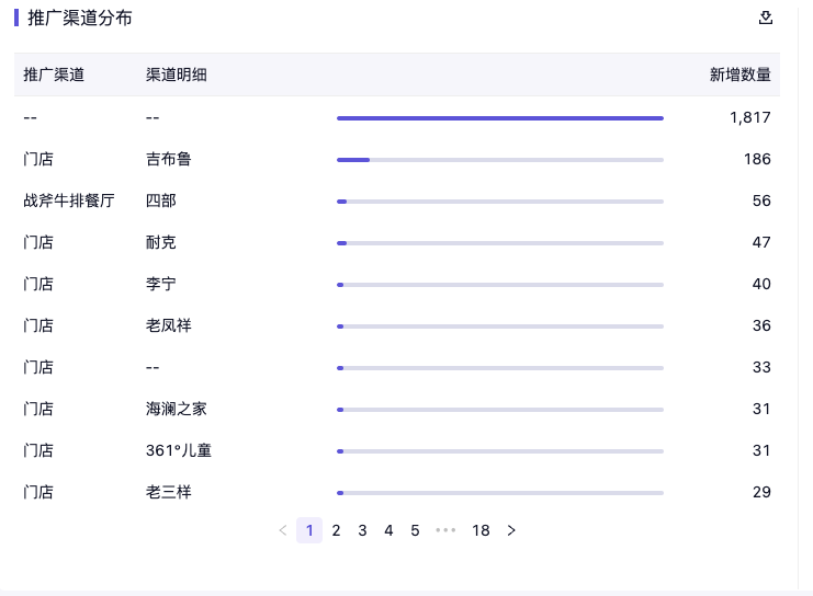 - 推广渠道分布:会员在商场内扫码成为会员时,所扫的开卡二维码往往含有推广渠道及推广明细,根据不同推广明细查看商户纳新力。对于显示“--”则是因为早些时候商场内的开卡二维码没有添加推广渠道和推广明细,故没有渠道明细。