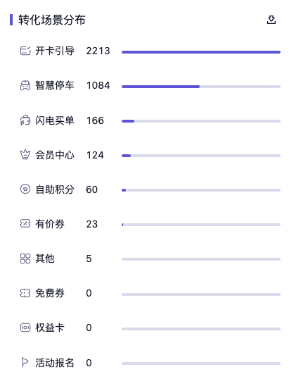 转化场景分布:根据顾客具体是在小程序哪个应用环节开卡进行数据统计,目前主要有开卡引导,智慧停车,会员中心,自助积分,有价券,闪电买单,免费券,权益卡,活动报名,停车券领取等,除前面所说场景,剩余场景被归属于“其他”。