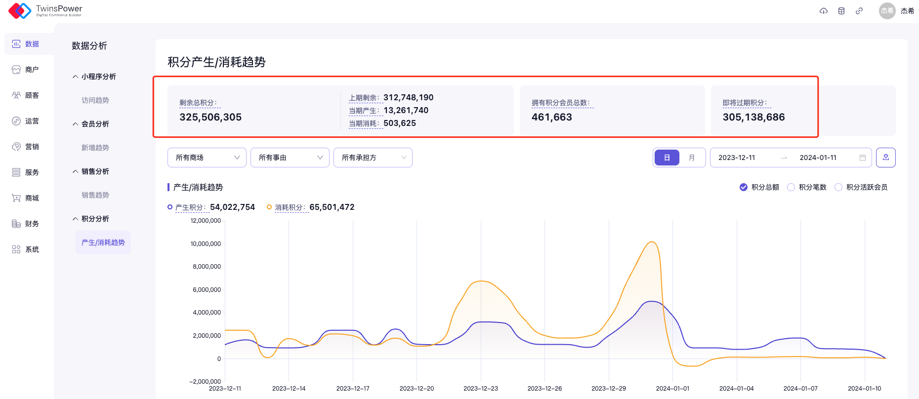 剩余总积分:全局/商场范围内剩余可被使用的积分总数,该数据实时更新