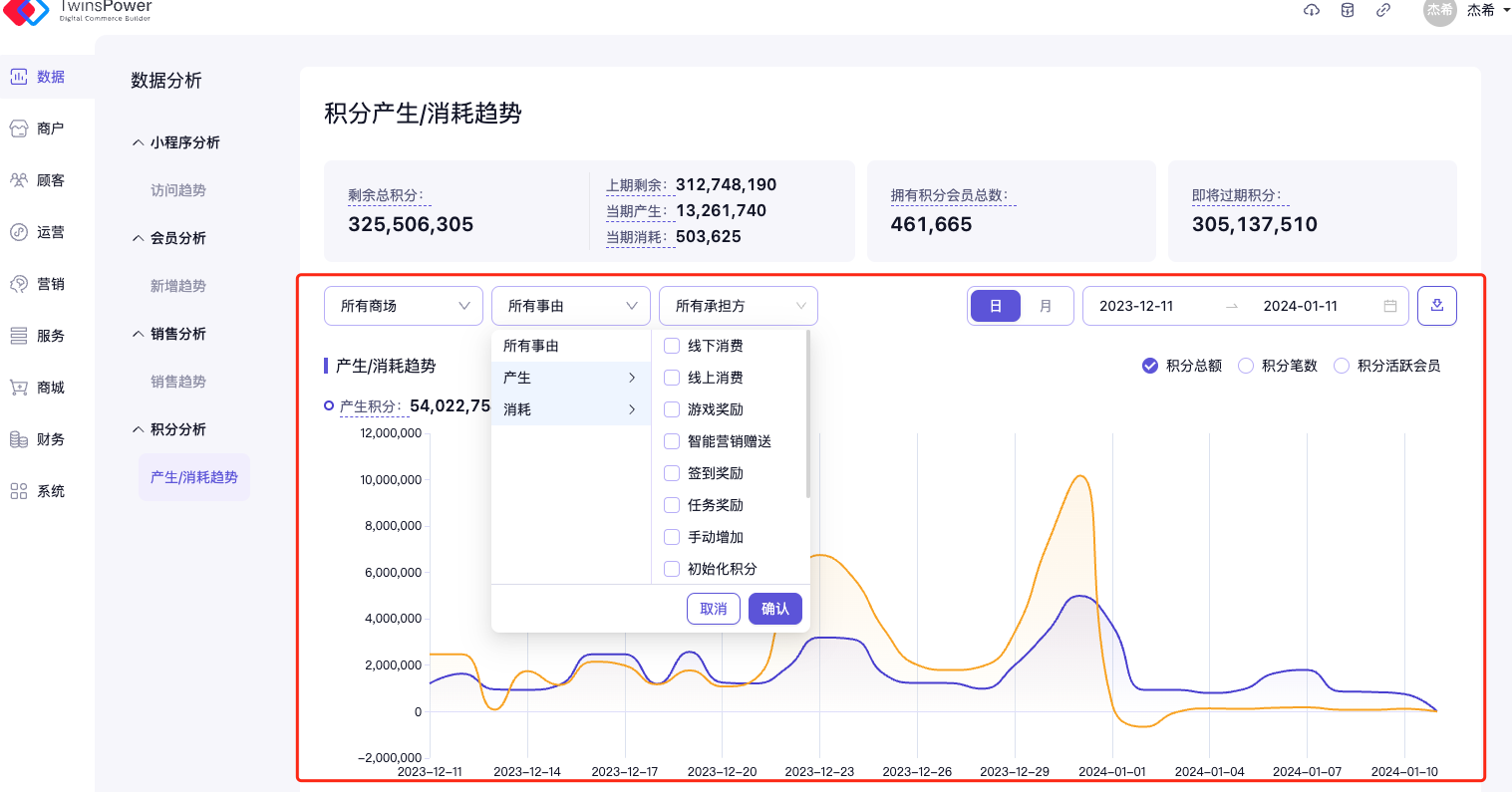 可在此处通过自定义积分事由,积分承担方,日期等条件进行自由结合,查看对应条件下的积分产生/消耗趋势