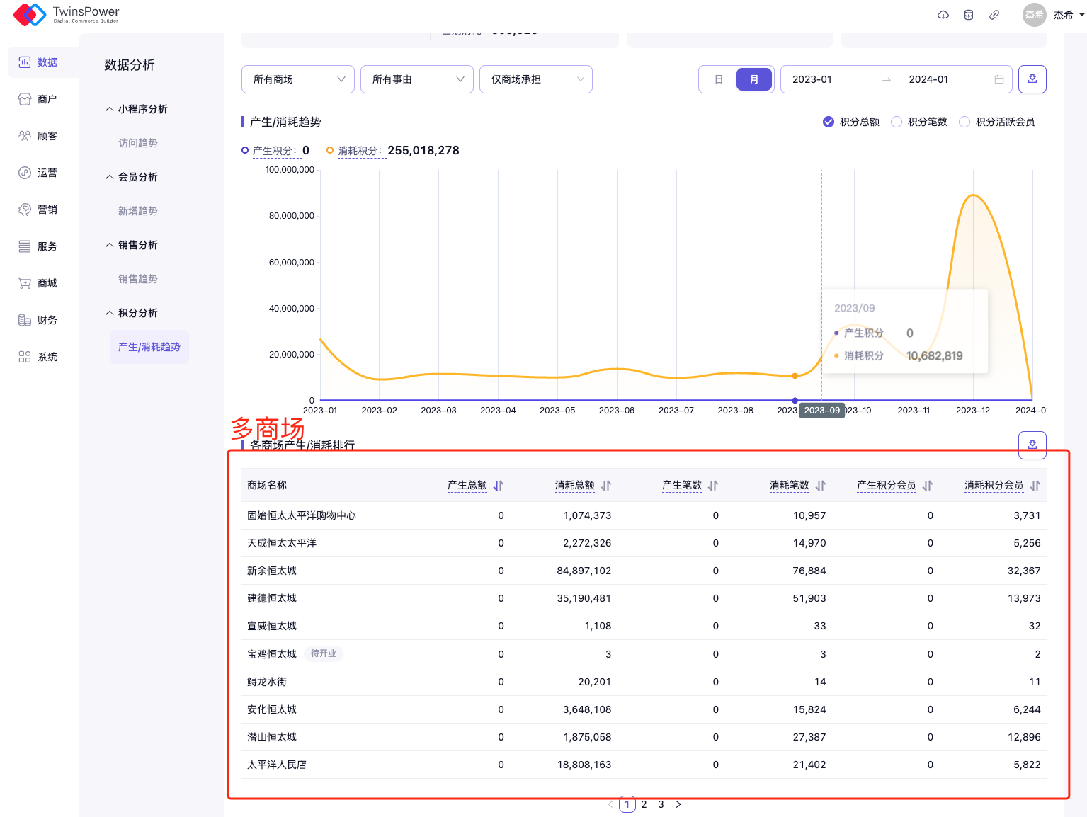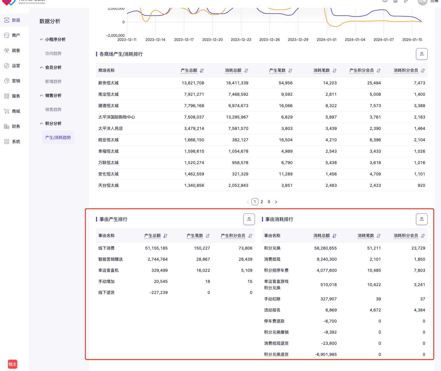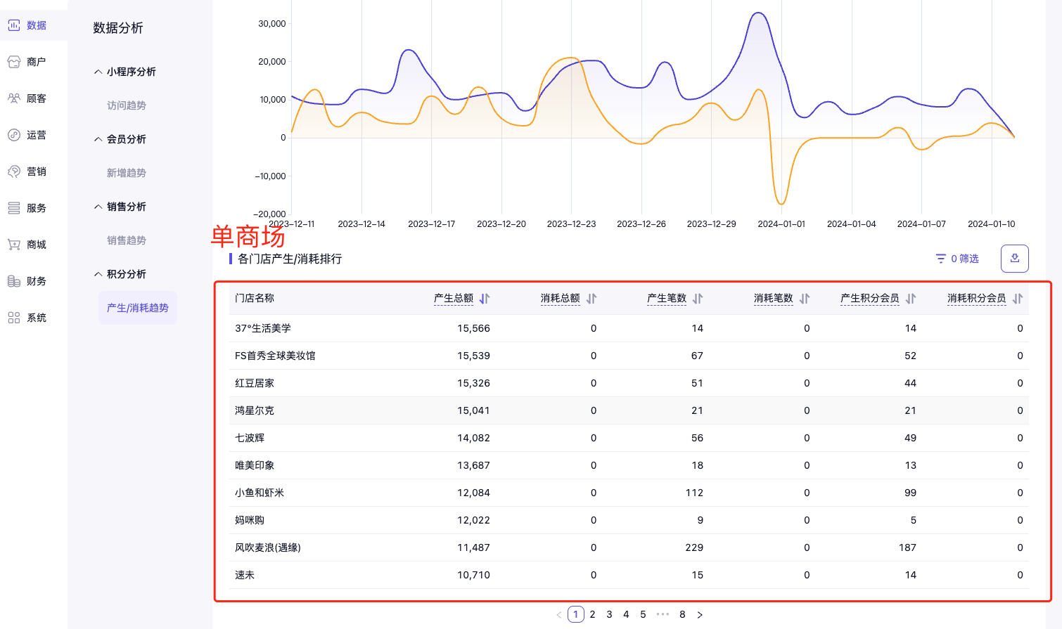 可在此处查看各商场/门店的积分产生/消耗排行