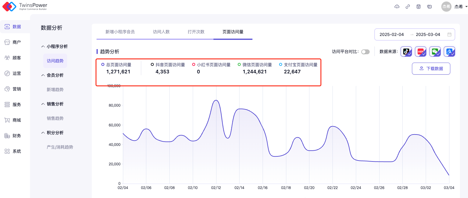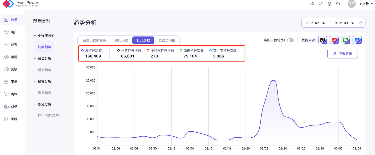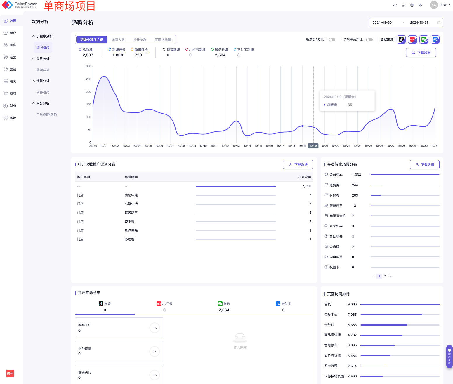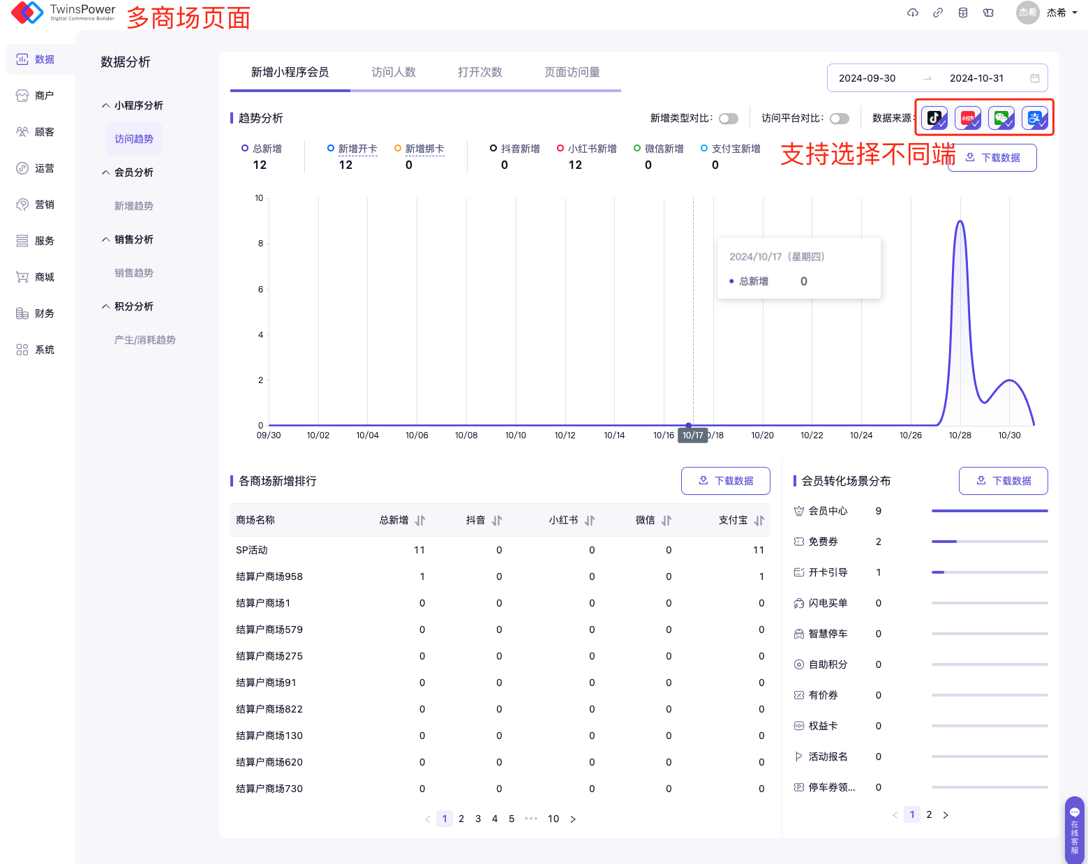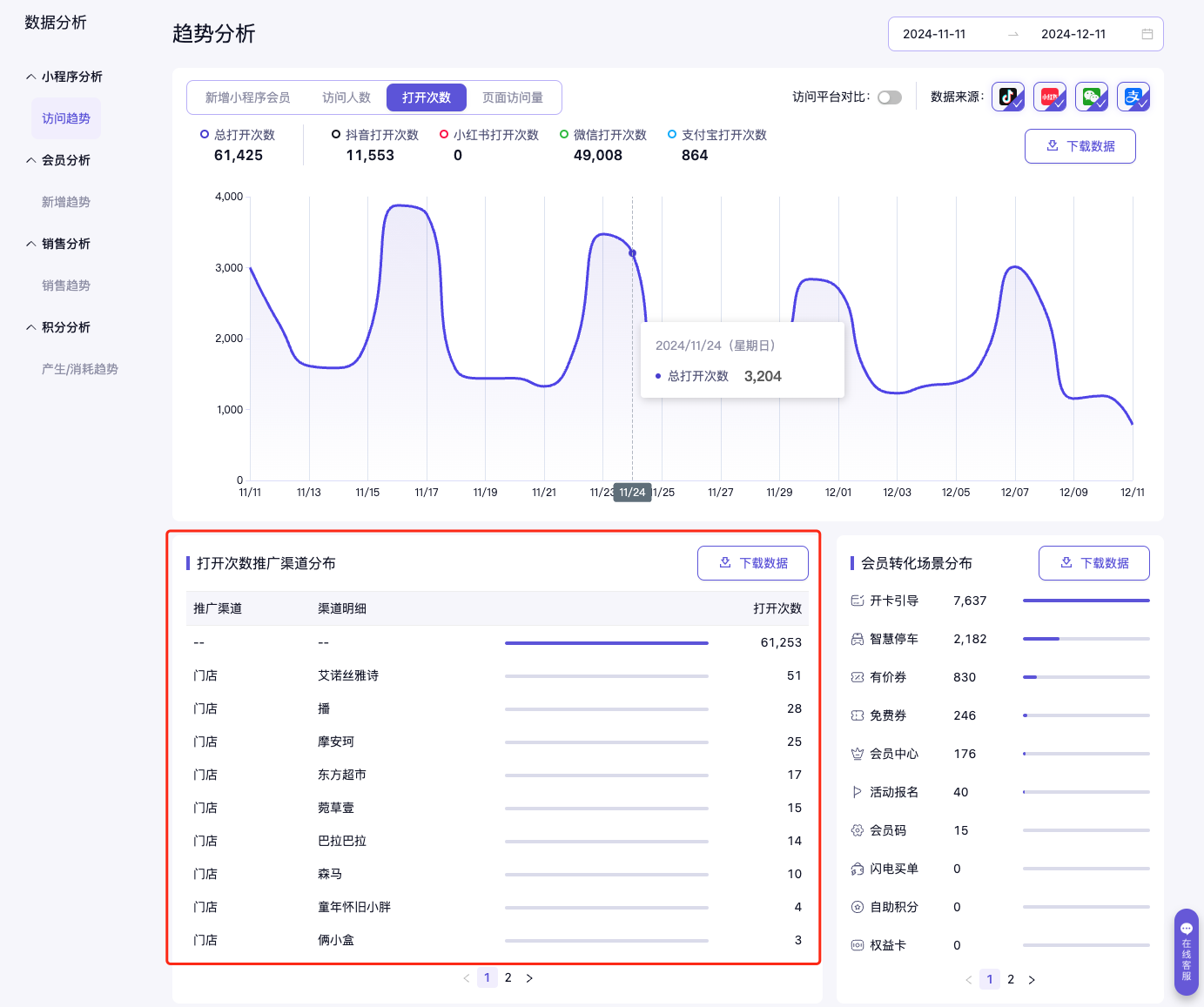 - 可分别点击查看抖音/小红书/微信/支付宝四端的新增小程序会员数据