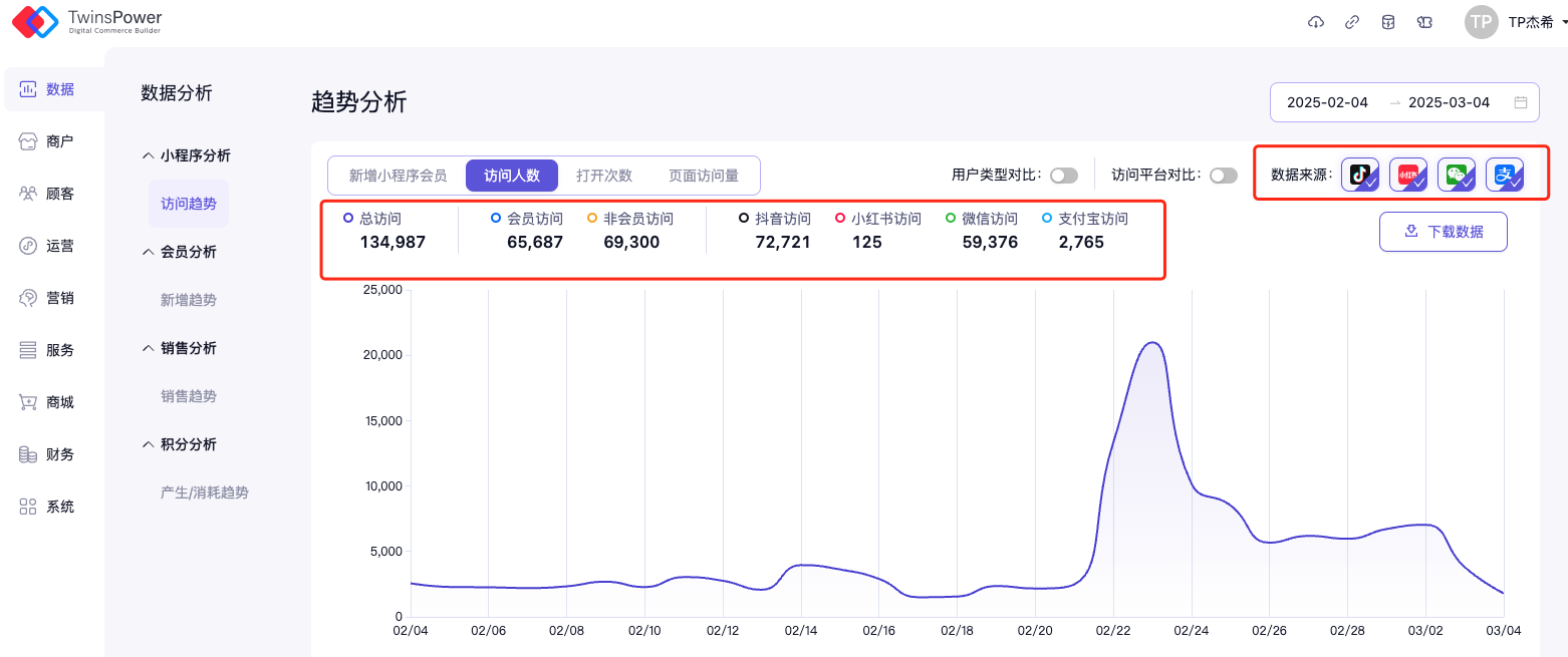 - 趋势分析图中支持对用户类型(会员和非会员),访问平台(抖音/支付宝/微信/小红书)进行对比