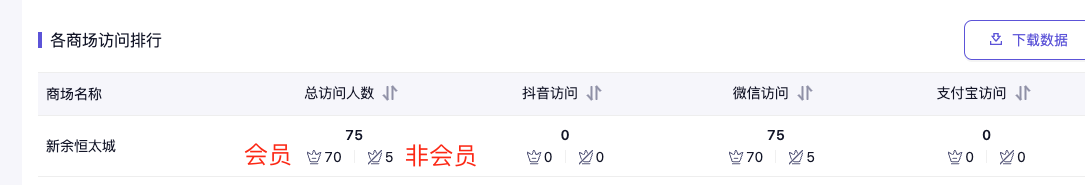 - 多商场项目可查看各商场中访问人数,其中总访问人数包含会员和非会员