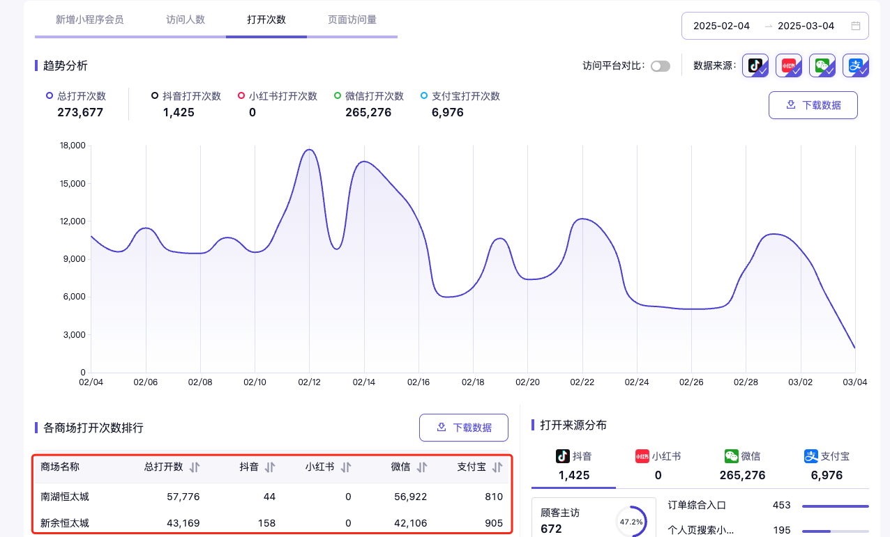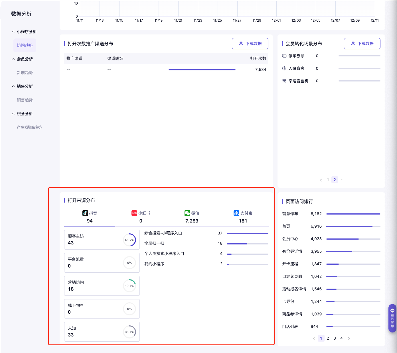 用户打开小程序的来源分布,不同平台小程序会有不同的来源,例如抖音端会有顾客主访、平台流量、营销访问、线下物料等来源。每一种来源又会细化具体的来源,例如顾客主访中就包含通过综合搜索-小程序入口、全局扫一扫、个人主页搜索小程序入口、我的小程序等具体入口。