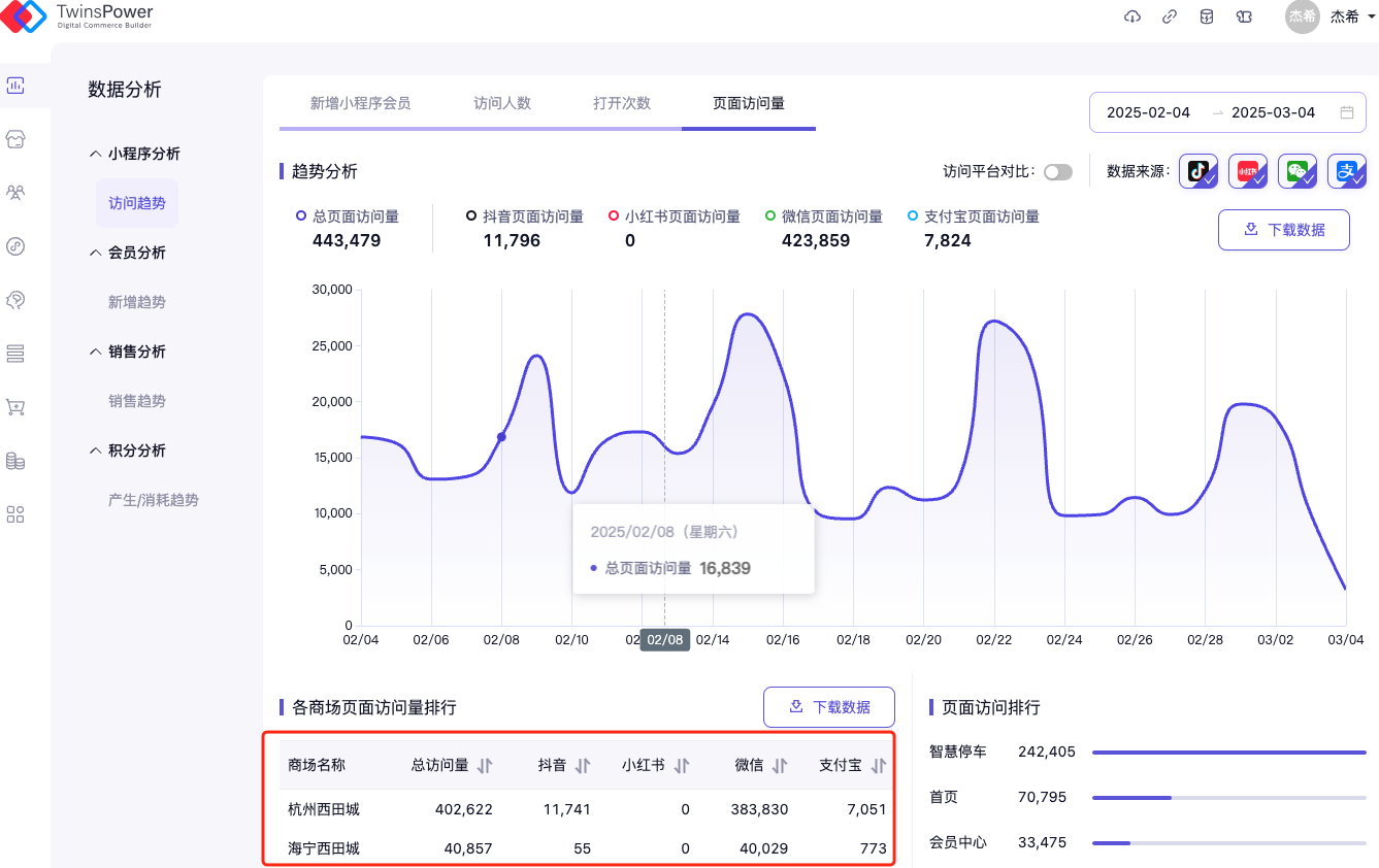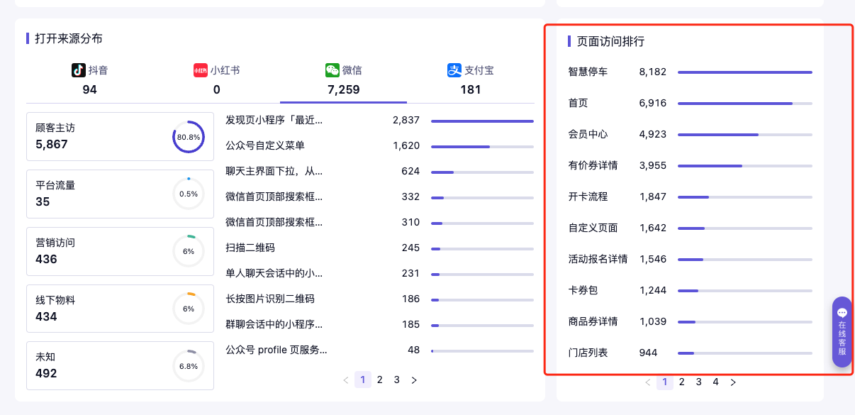 - 当有多商场权限时,可查看各商场页面访问量排行