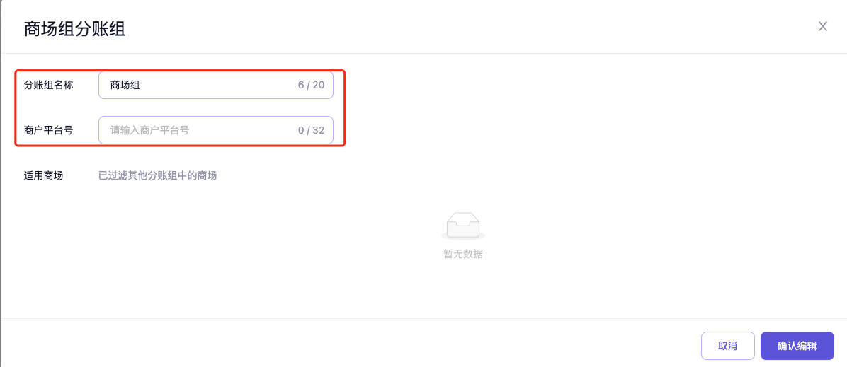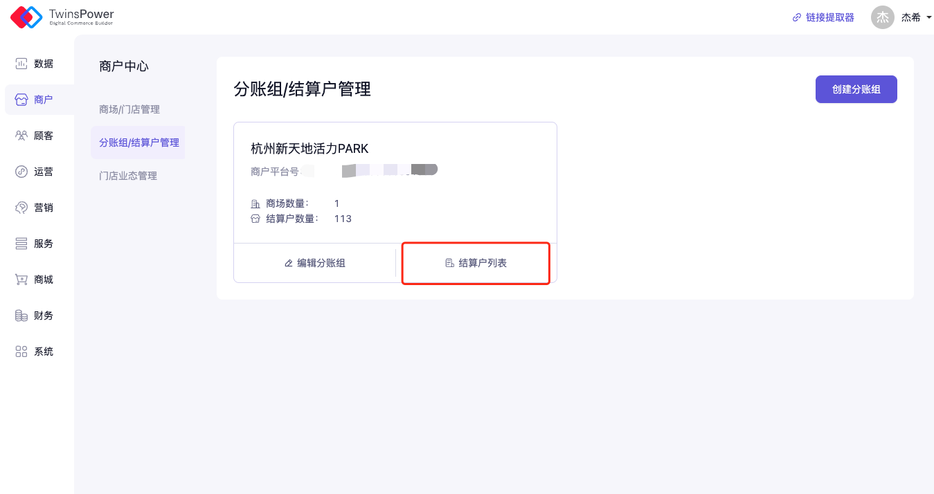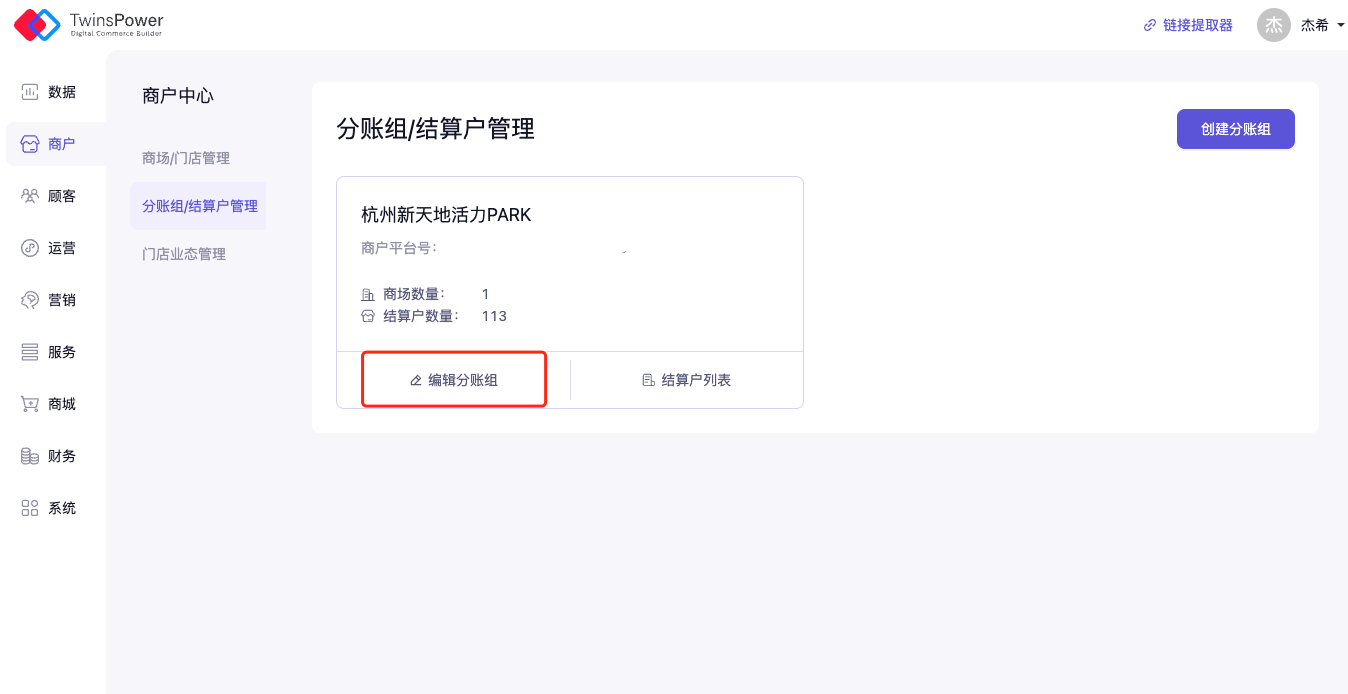 分账组可理解为 商场侧的资金归属分组,主要用于在 多商场 / 集团型项目 中,区分不同商场对应的结算对象。
