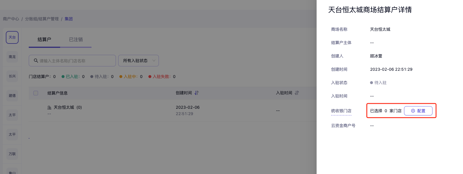 - 进入门店列表,选择门店并确认后,系统将自动完成结算户创建。