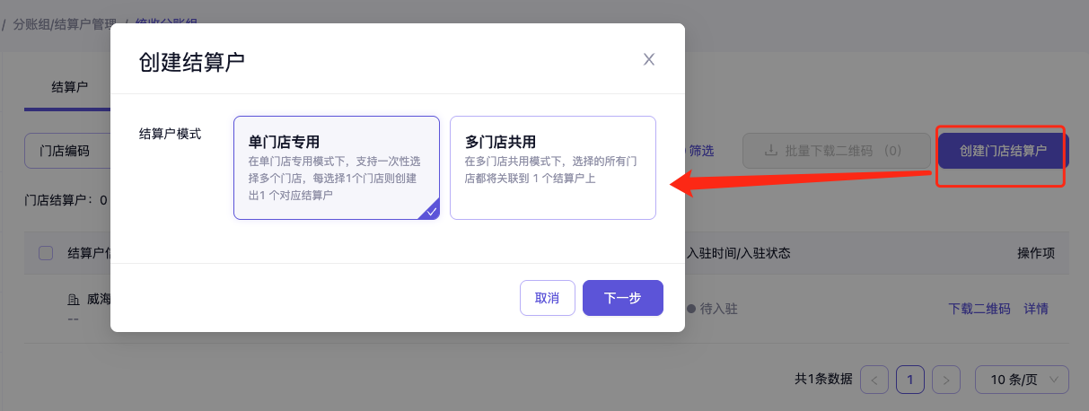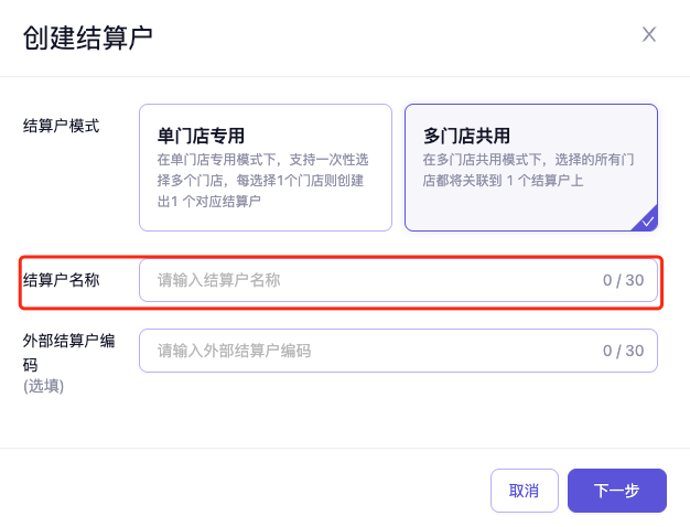 - 单门店专用:支持一次性选择多个门店,每选择1个门店则创建出1个对应结算户。即一个门店对应一个结算户,结算户名称即门店名称