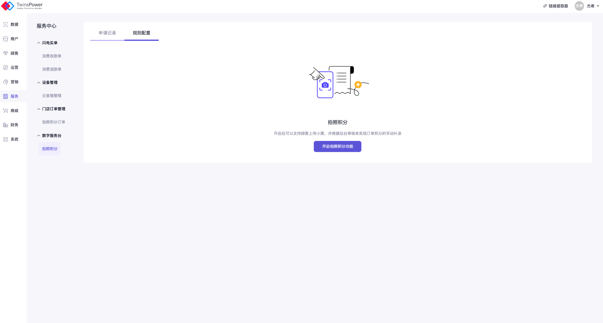 服务中心 → 数字服务台 → 拍照积分 → 规则配置中开启拍照积分。系统默认关闭状态。开启后也可在此处关闭拍照积分功能。
