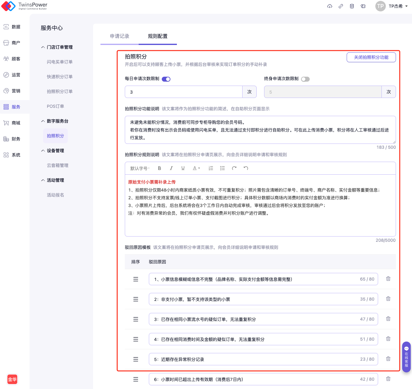 开启拍照积分功能后,可在此配置拍照积分相关规则及说明,用于规范顾客使用行为并辅助审核。