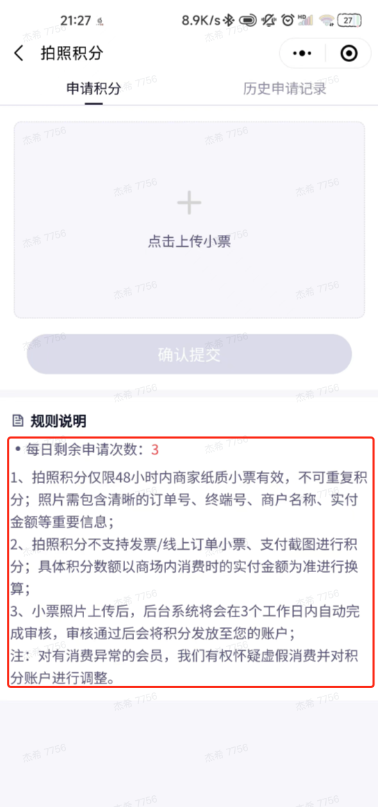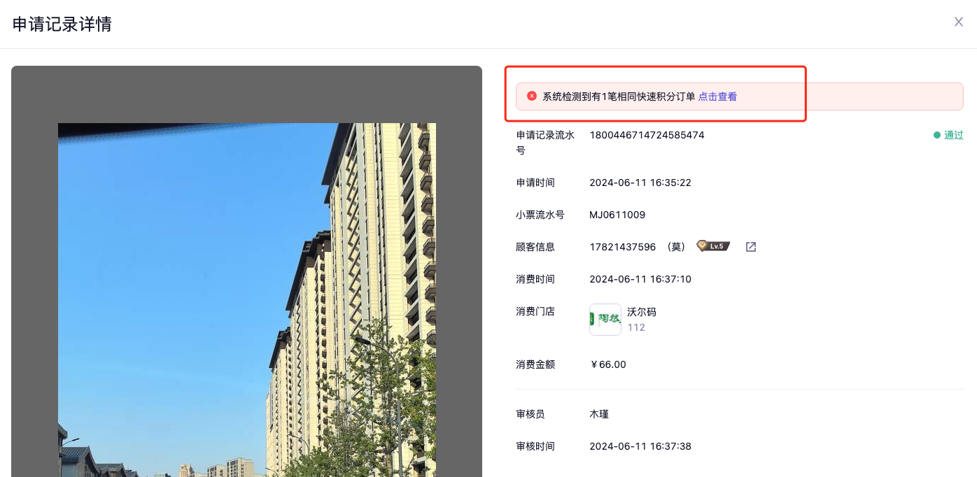 - 系统会自动显示提交拍照积分订单的会员信息以及至申请之日前7天是否有消费积分记录,可点击快速查看。
