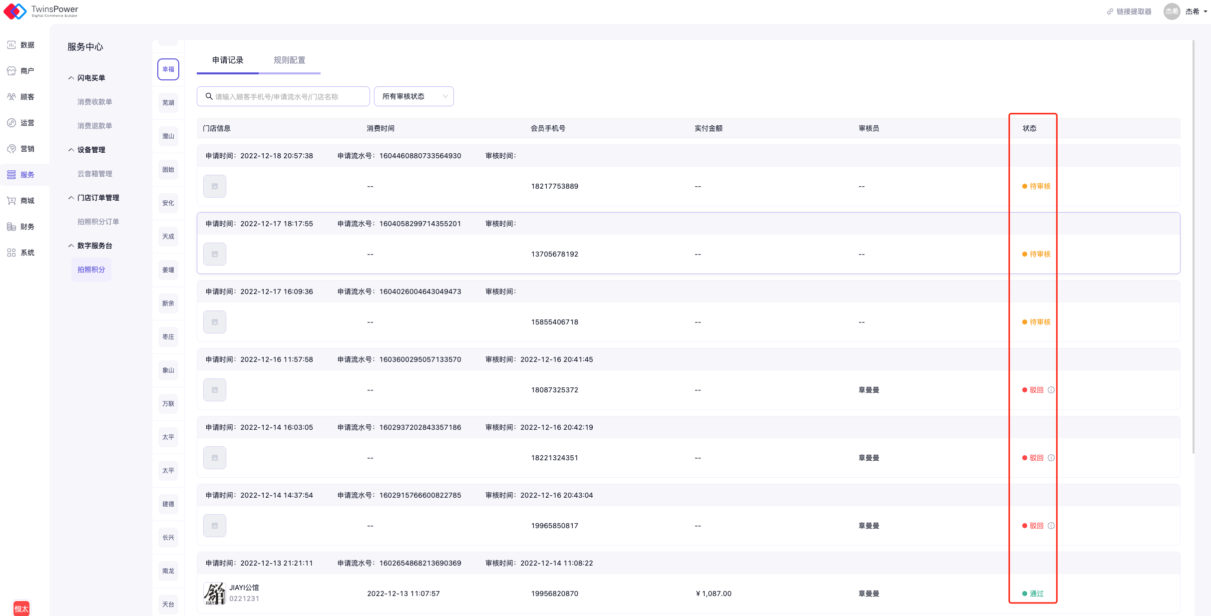 对于审核错误的订单,可根据顾客手机号/门店名称/申请流水号,在【服务中心 → 拍照积分 → 申请记录】找到对应的申请记录,点击进入详情页,进行作废订单。