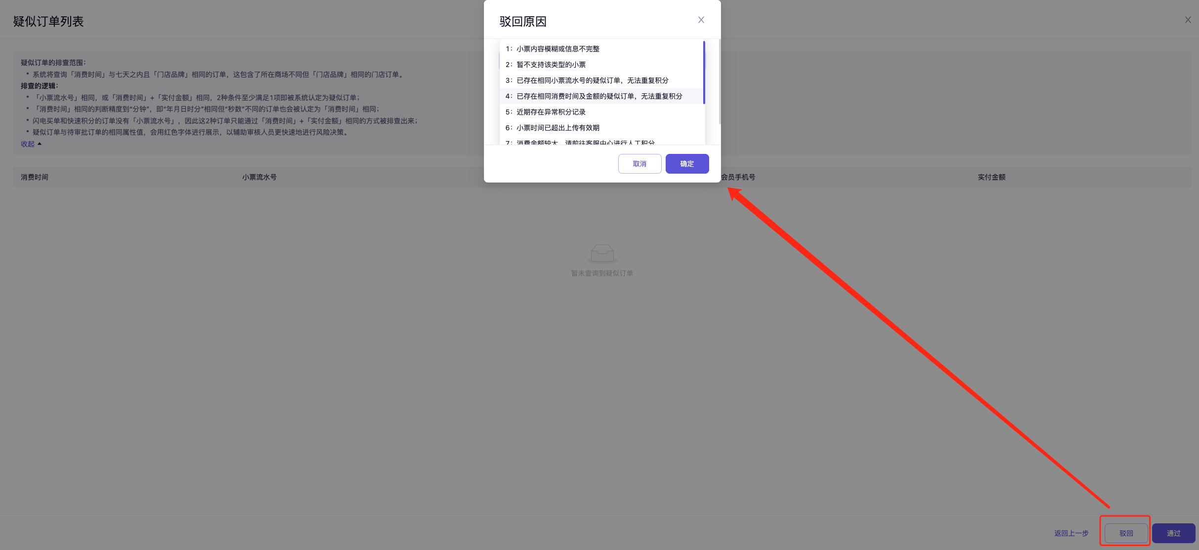 - 如果有疑似订单或者其他原因可进行驳回,可在驳回模板中快速选择,如果订单没有问题点击通过,该笔订单就会生成对应的积分