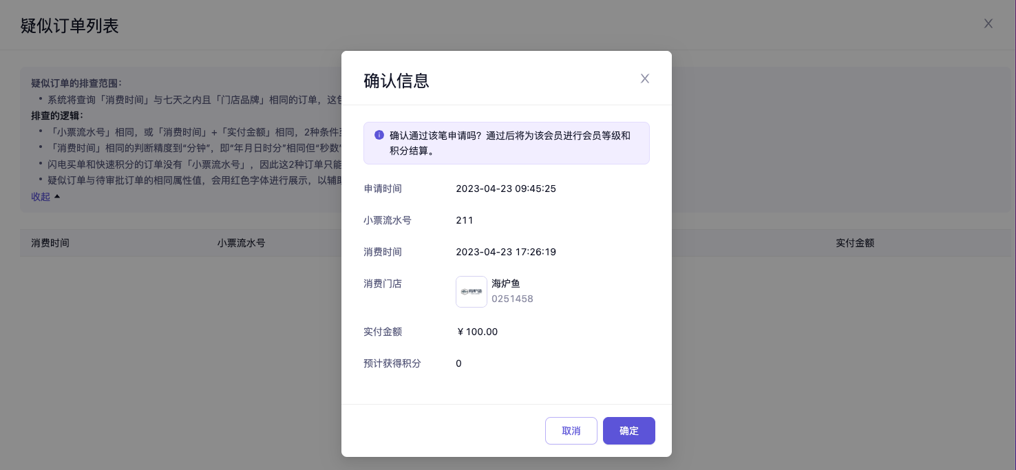 - 「小票流水号」相同,或「消费时间」+「实付金额」相同,2种条件至少满足1项即被系统认定为疑似订单;