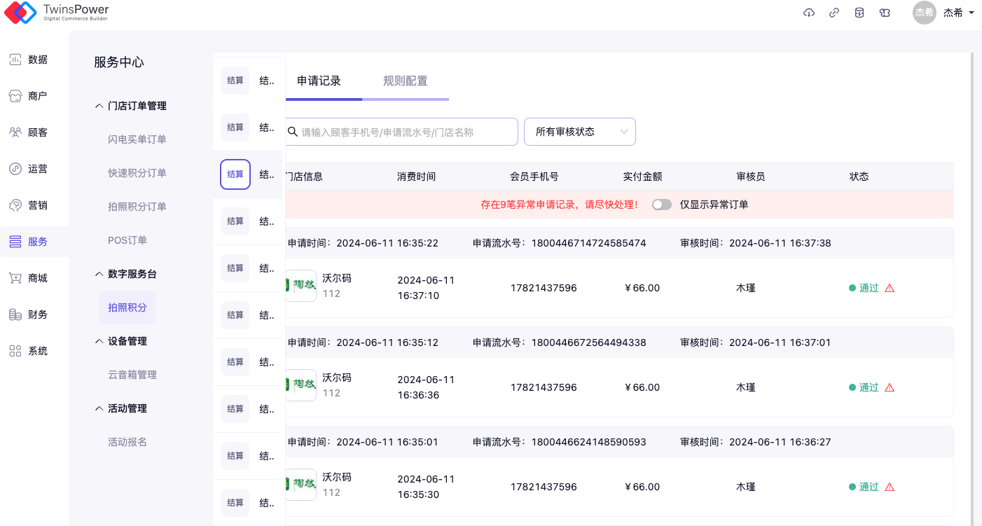 - 审核通过后,可在服务中心 → 门店订单管理 → 拍照积分订单 中查看此条订单