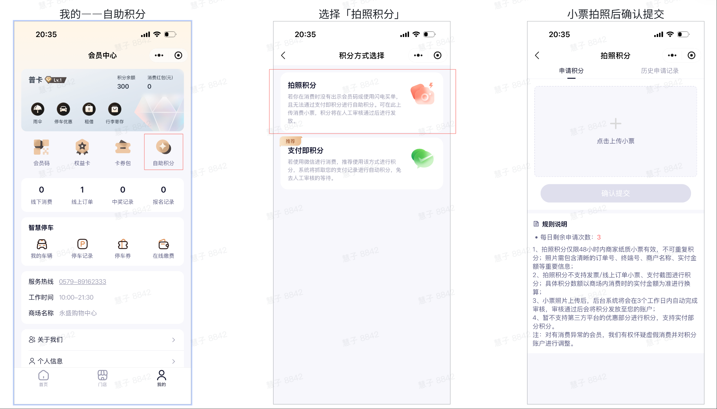 - 顾客端申请拍照积分路径:小程序 → 我的 → 自助积分