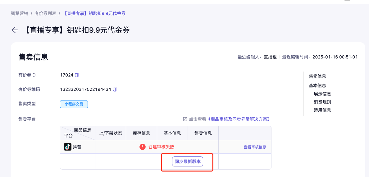 - 若是希望使用使用相同的有价券进行重新提交审核,可在有价券详情中点击「同步最新版本」,将该有价券信息再次同步平台进行审核。