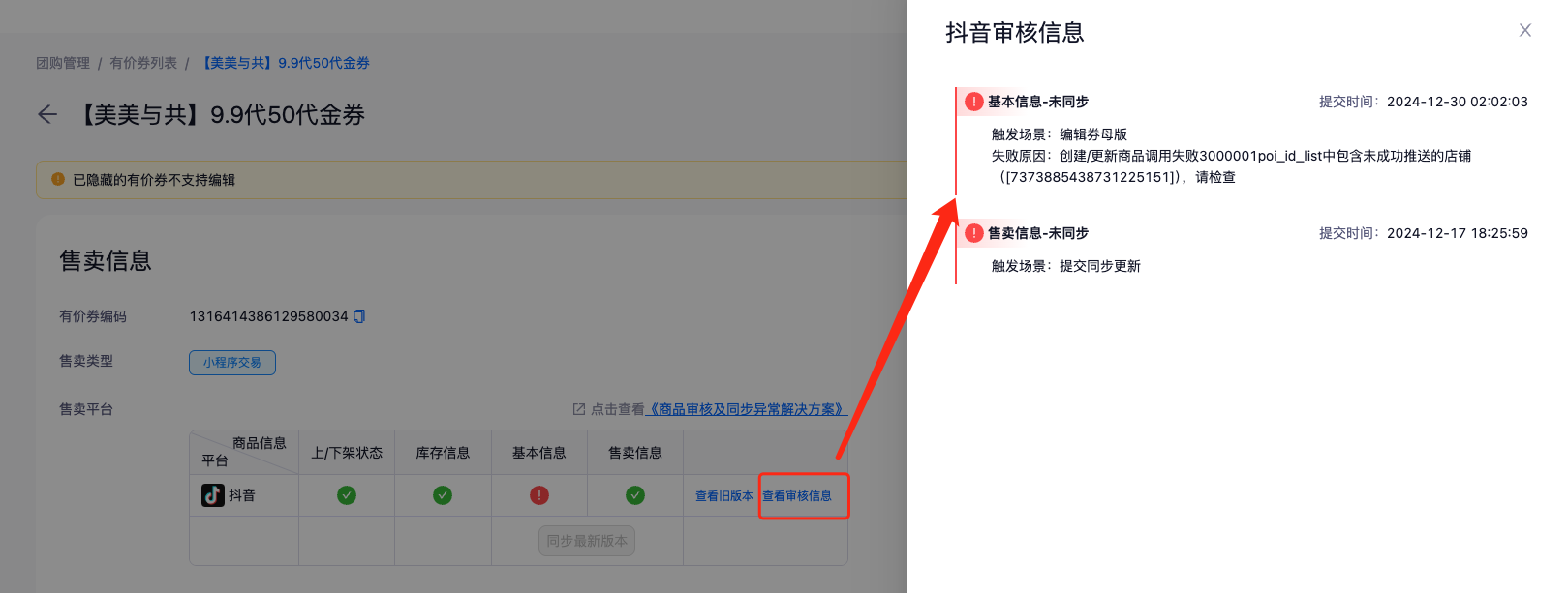 - 对于更新审核失败的券,可在售卖平台概览中筛选「更新审核失败」的券,点击进入详情页查看具体失败原因,再根据失败原因修改后重新提交审核。如何修改可查看有价券编辑