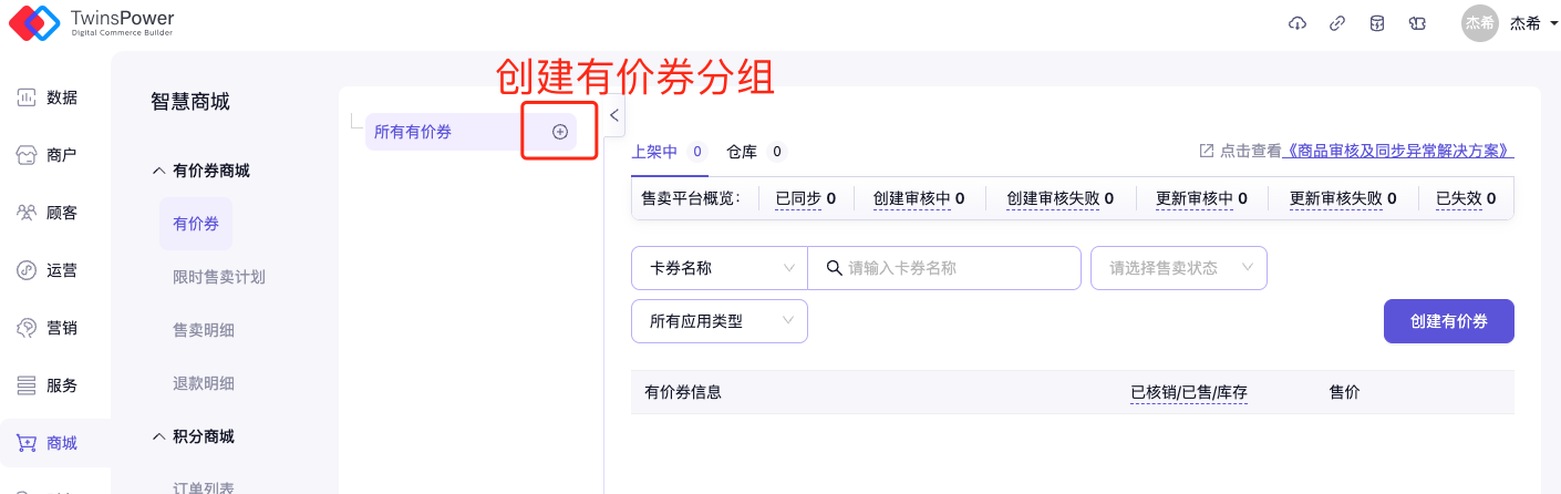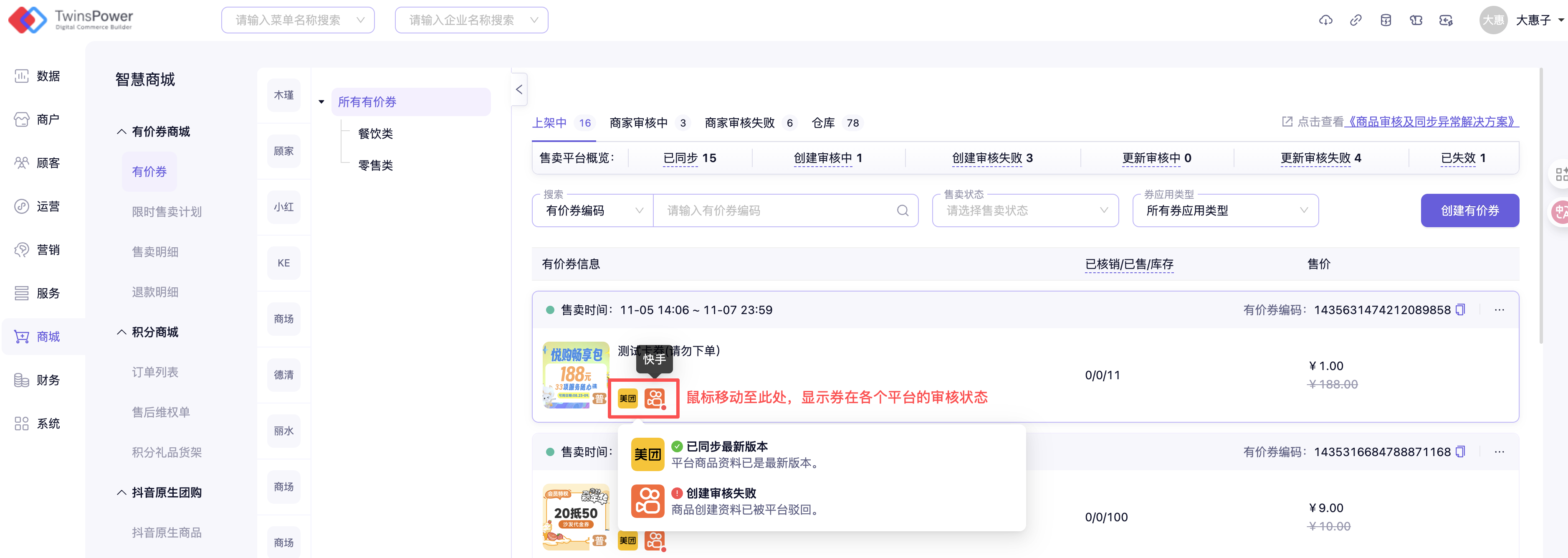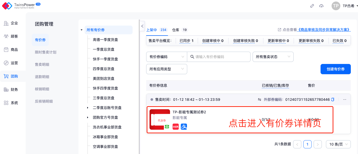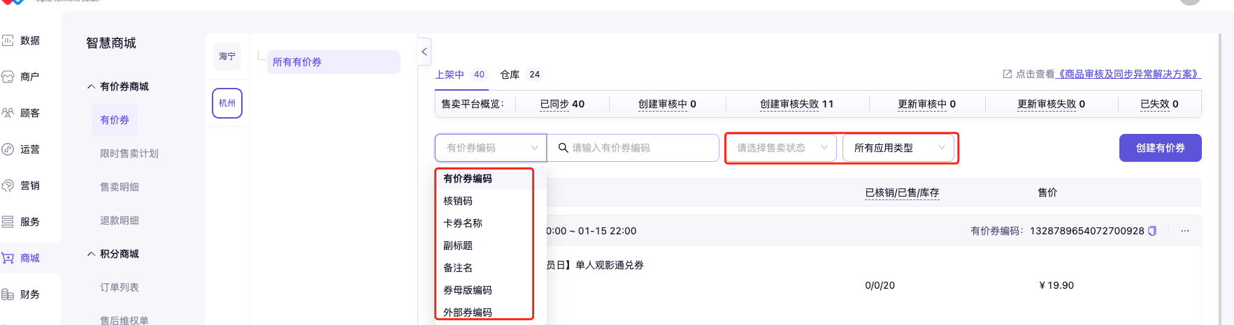 在售卖平台概览中可点击不同状态下券的数量,将会自动跳转至该状态下所有券列表中,从而进行券管理。
