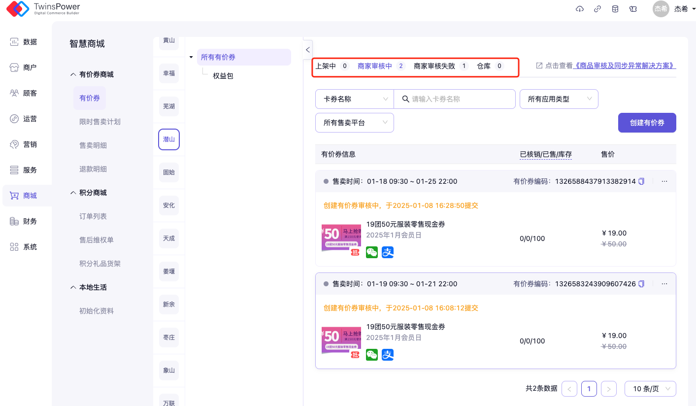 有价券创建完成后根据不同状态分别展示在以下四个列表中:商家审核中、商家审核失败、上架中、仓库