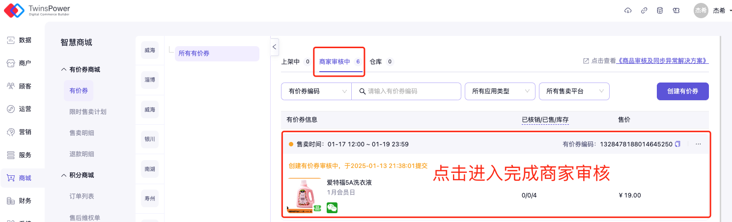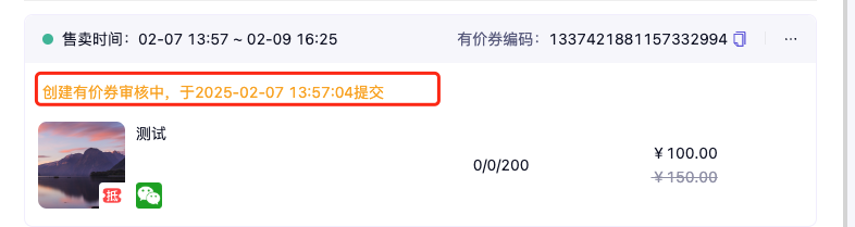 若开启了有价券审核模式,则有价券创建/编辑修改完成后,首先进入商家审核中的状态,对应审核人员审核完成后该有价券才会上架或进入仓库。如果涉及到售卖平台审核则在商家审核完之后方才进入平台审核中。