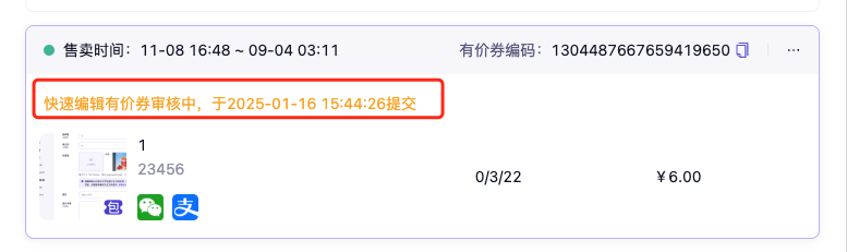 - 编辑售卖信息:即可以编辑修改售卖相关的信息,如延长售卖时间,调整售卖金额等。该部分的内容修改将会触发平台审核,审核通过后方可生效。若编辑的内容未通过审核,则有价券信息仍保持未编辑修改之前的内容。
