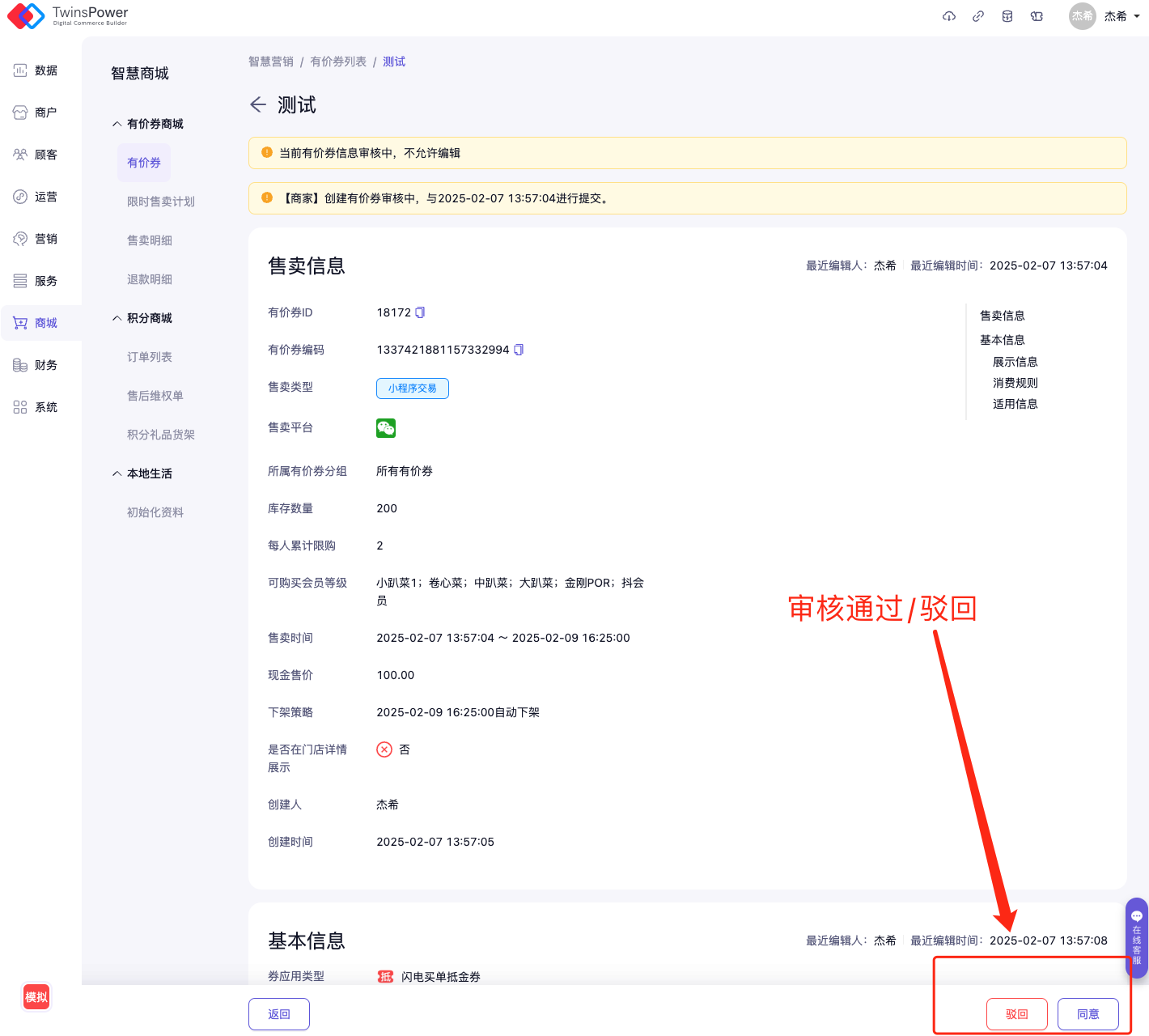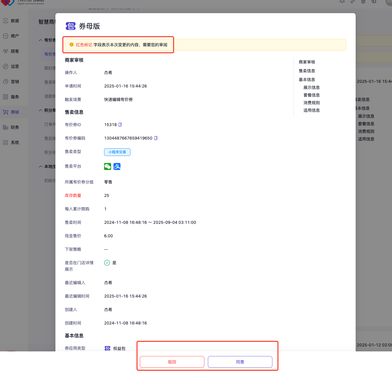 页面会提示该有价券是首次创建的审核还是编辑有价券的审核,其中若是编辑有价券的审核,将会通过红色字体突出修改内容,便于审核人员快速知晓所编辑修改的内容