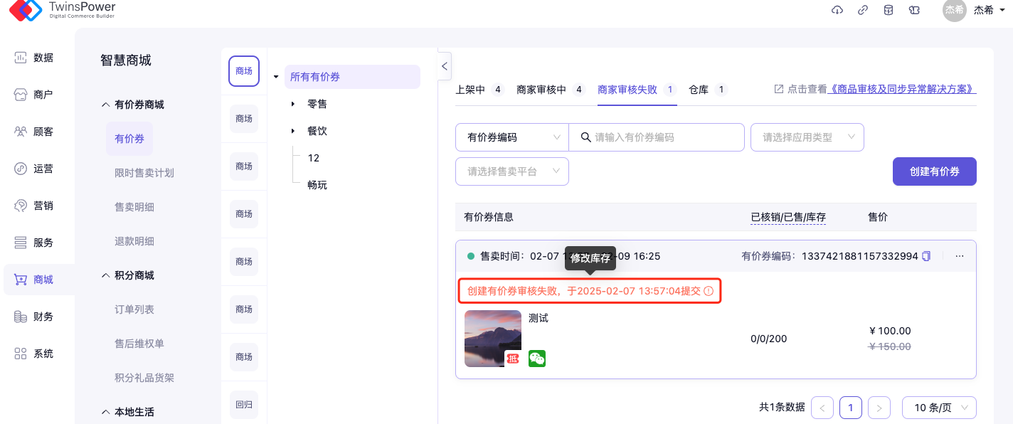 - 对于创建审核失败的券,可在售卖平台概览中筛选「创建审核失败」的券,点击查看对应有价券失败原因,根据失败原因进行修改后重新提交审核。如何修改可查看有价券编辑