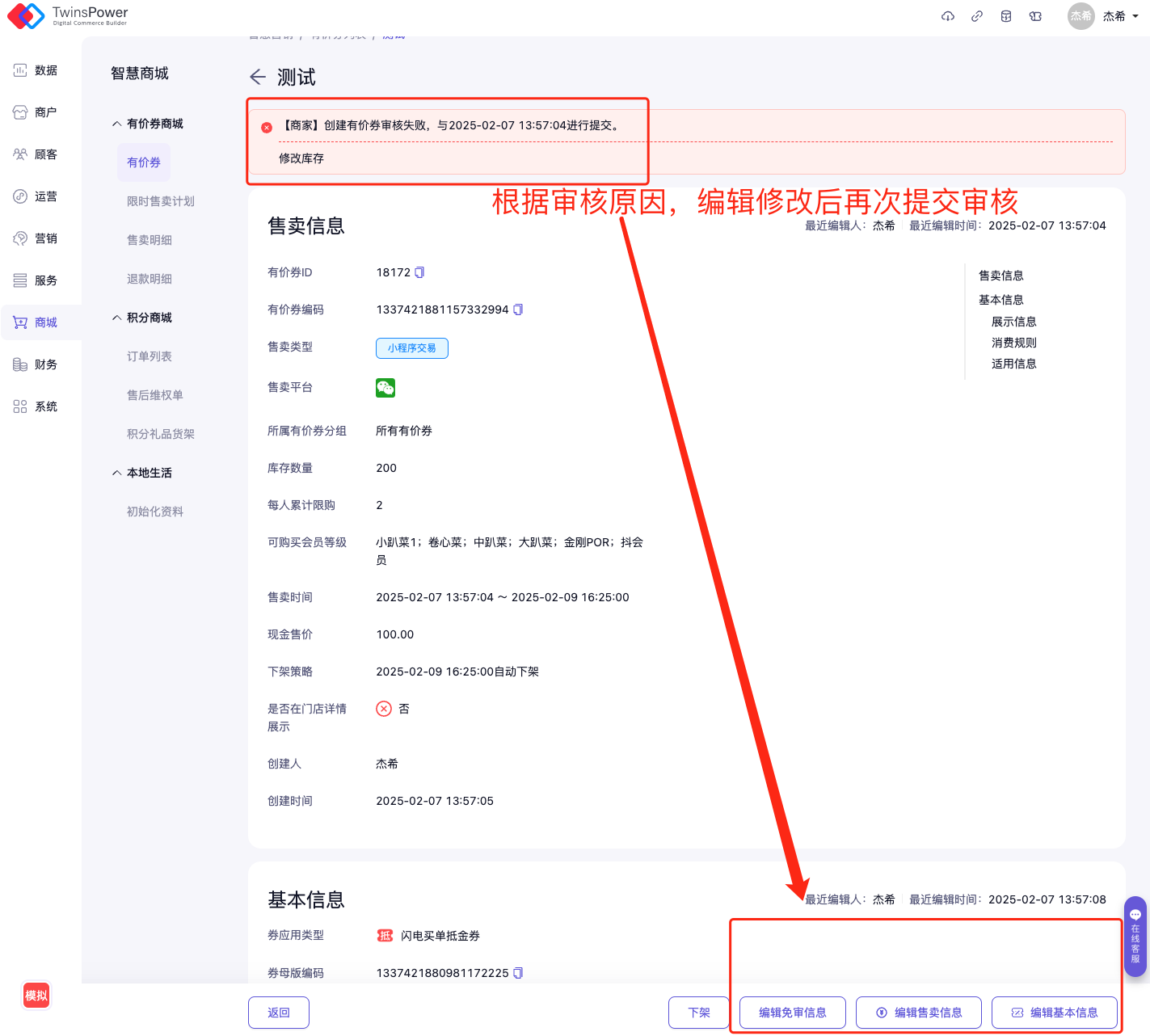 - 进入券详情页,根据审核驳回原因,编辑修改相关信息后,再次提交审核。(该步骤无需再新建,可在驳回的券信息中直接修改)