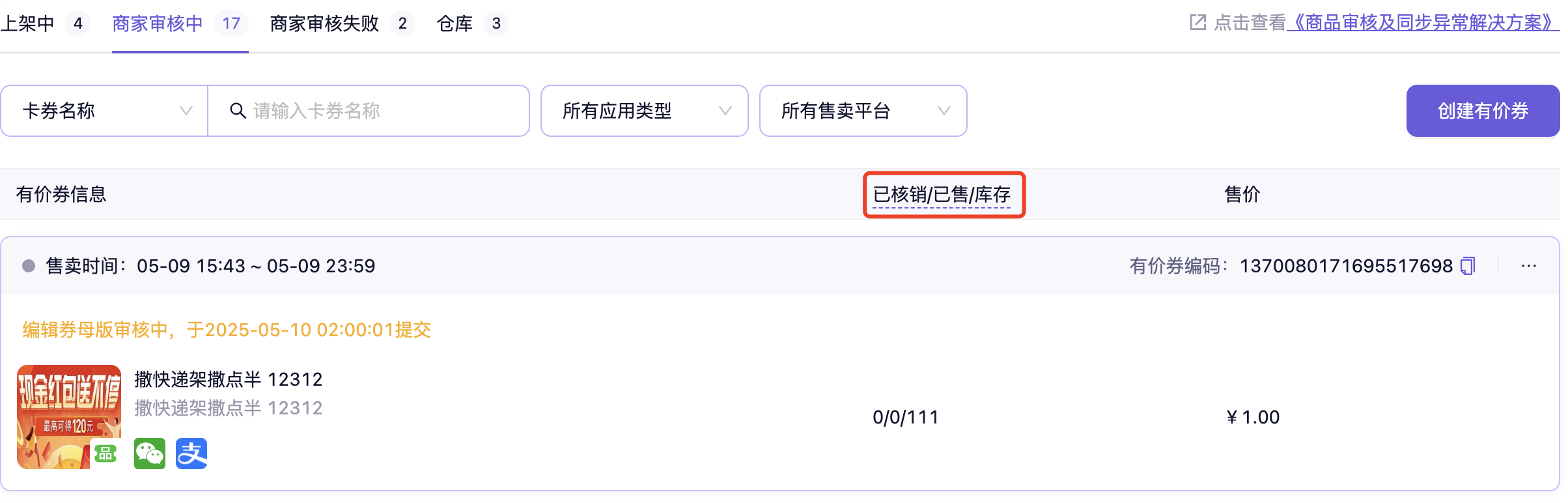 创建审核中:有价券任一售卖平台创建审核中,则计入“创建审核中”。只有审核通过后方可上架售卖
