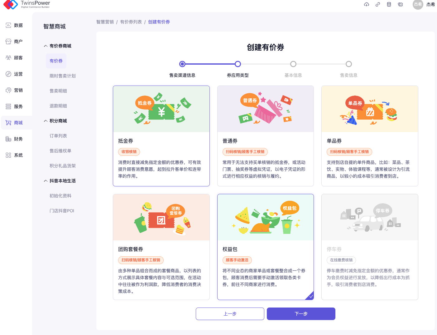 - 权益包:顾客手动激活,通常是将不同业态的商家单品或套餐整合成一个券包,顾客消费后需要手动激活领取各类卡券,前往不同商家进行消费