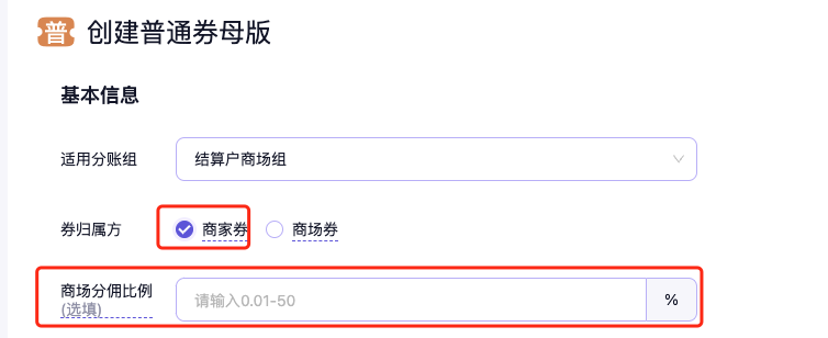 - 商场分佣比例:若选择商家券,支持设置分佣比例,即商场可通过帮商家/门店代售卡券的方式赚取佣金(最大不能超过50%)。