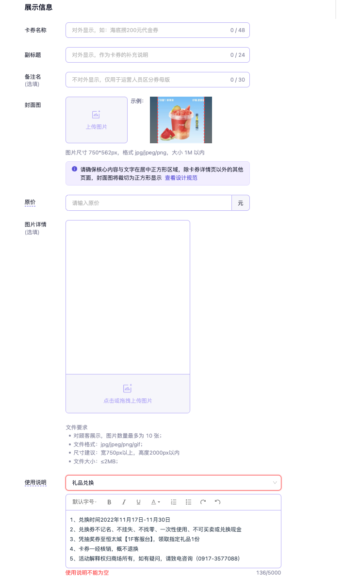 - 展示信息:可修改卡券的名称,封面图,图片详情、使用说明等C端展示信息
