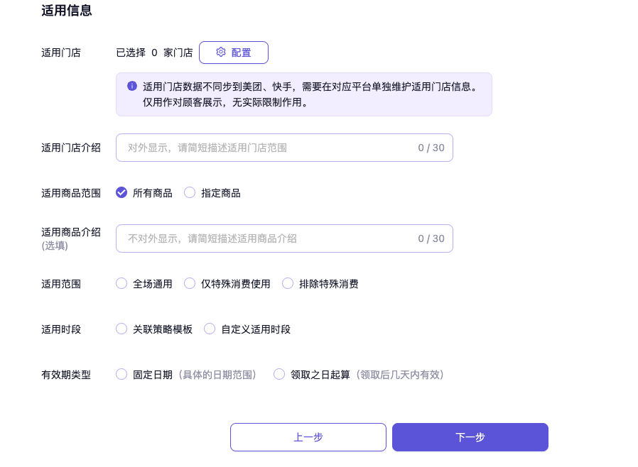 - 适用分账组:卡券资金结算的对象,默认选择当前商场组即可