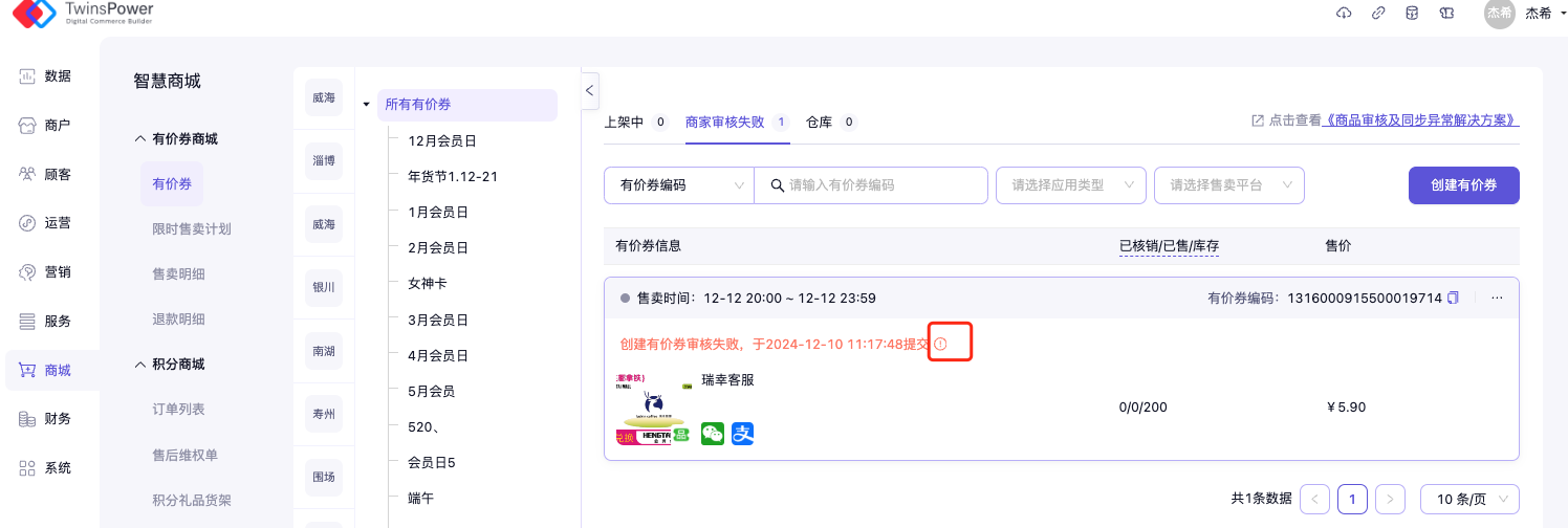 - 对于被商家审核驳回的券,可在“商家审核失败”中查看驳回原因
