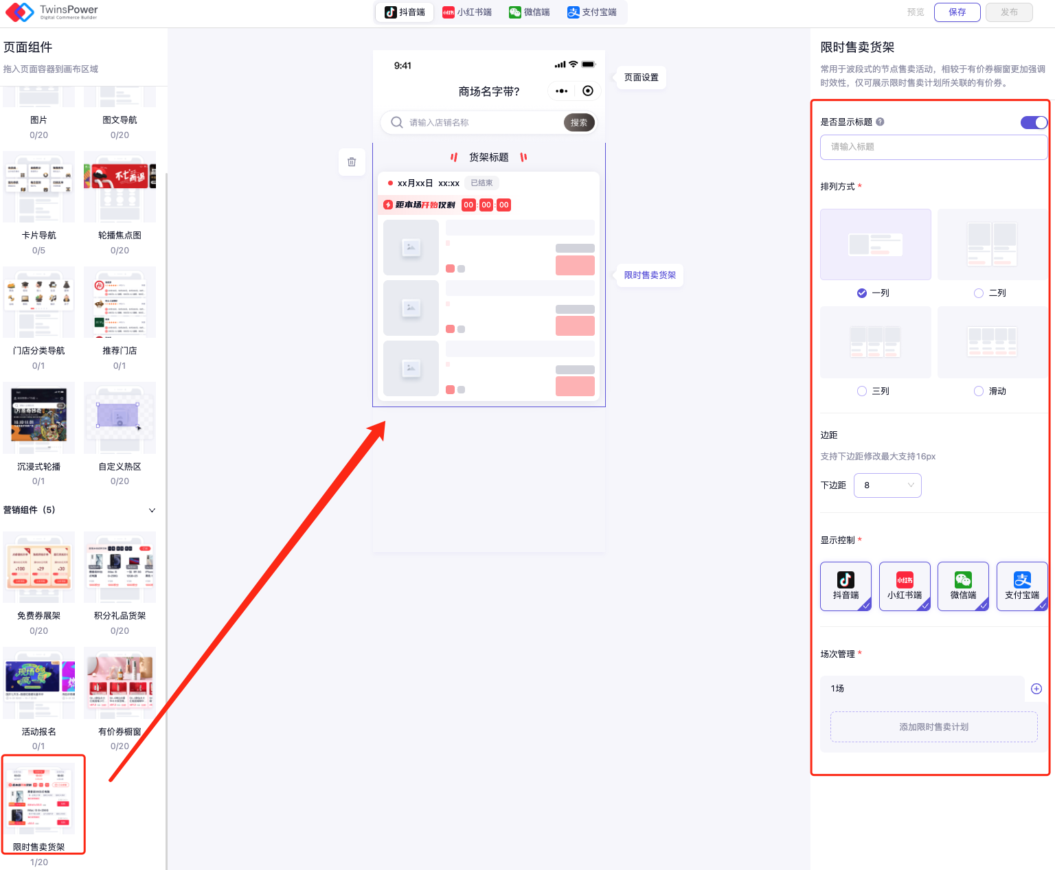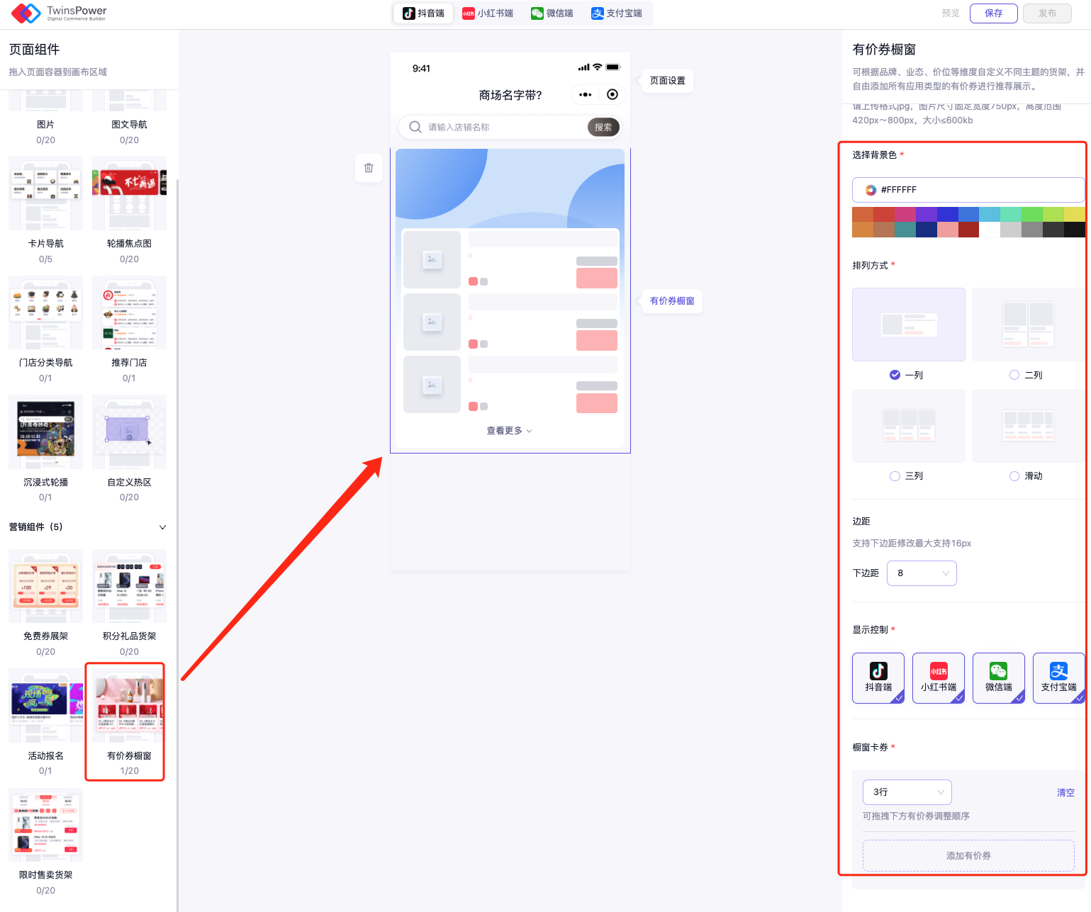 - 在运营-页面装修-首页或者自定义页面中,选择有价券橱窗组件/限时售卖组件