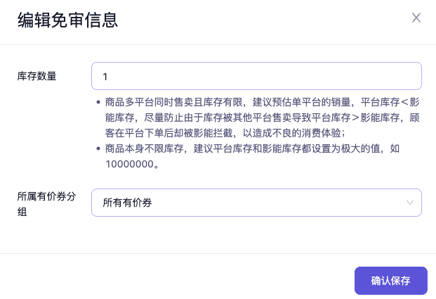 - 每人累计限购(选填):可以修改每人累计限购次数,从而放开或限制每个用户的购买次数