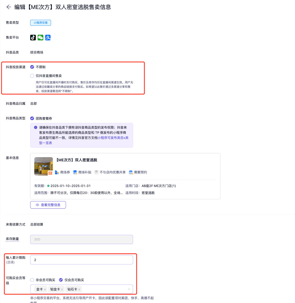 - 抖音投放渠道:若所修改的有价券在抖音平台售卖,则支持对抖音投放渠道进行重新选择