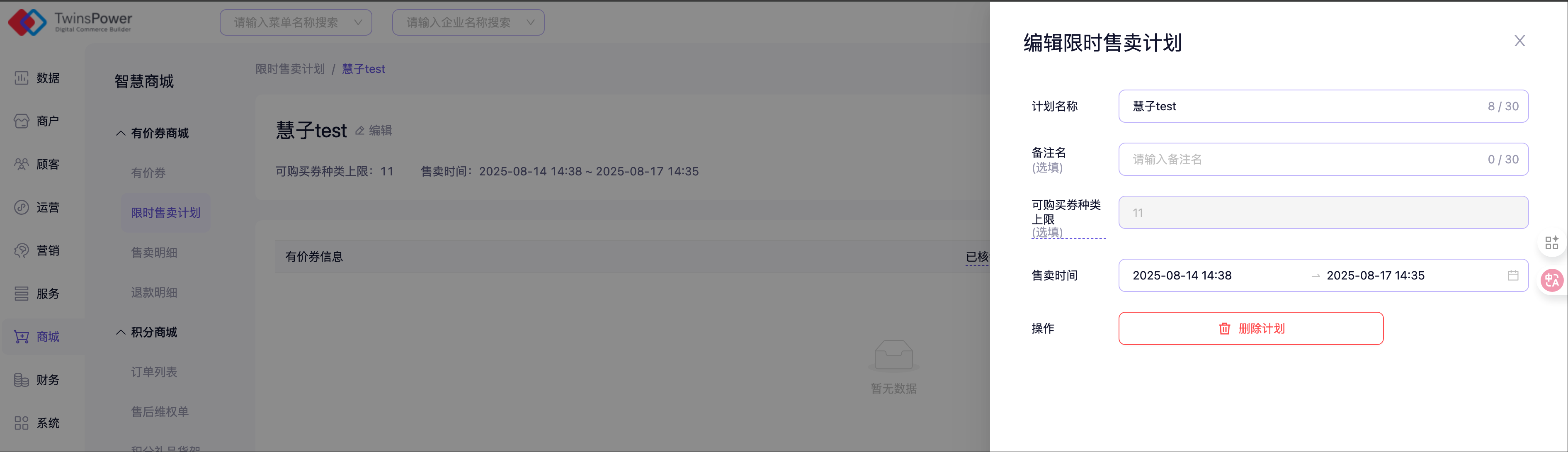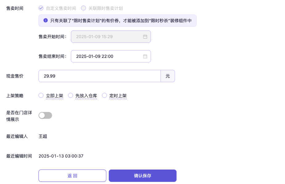 - 若限时售卖计划已过期,则无法再次修改售卖时间;如需再设置限时售卖,只能重新创建