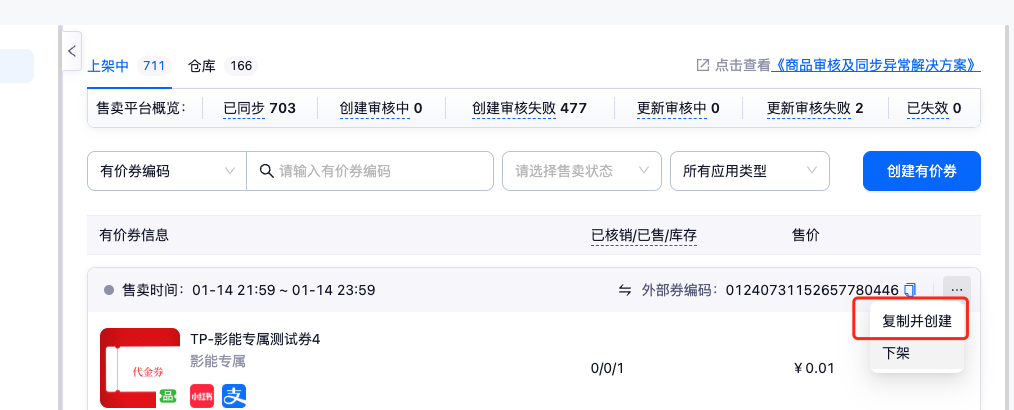 有价券创建完成后,点击进入有价券详情页,在售卖平台中可查看该有价券在各平台同步的最新信息,以及可针对不同状态进行处理: