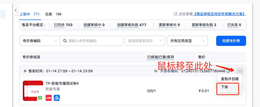 - 下架:对于正在上架中的券,若不需要再进行售卖时,可将其手动下架