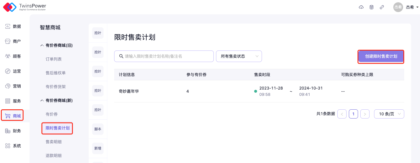 当我们需要在同一个时间段去售卖多个商品/卡券时,可先设置限时售卖计划,这样在创建有价券时,在售卖时间设置中直接关联限时售卖计划即可实现同个时间售卖多张券。