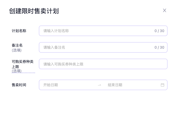 - 可购买券种类上限(选填):单个用户在该限时售卖计划中,可购买的不同有价券种类上限。